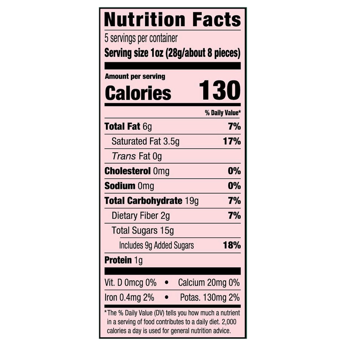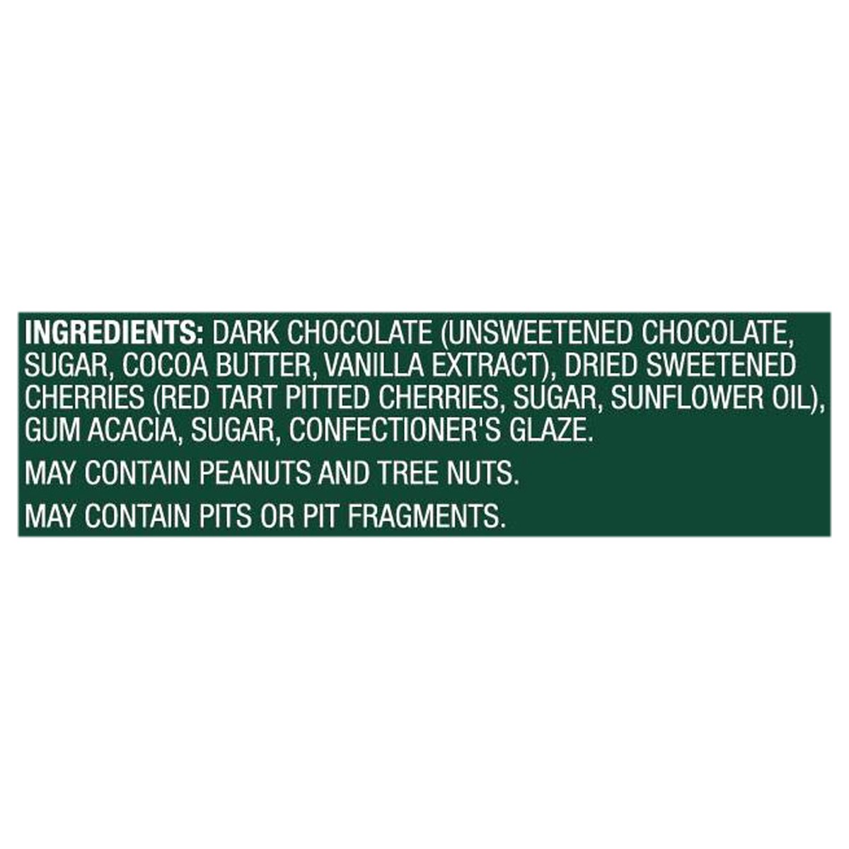 Dark Chocolate (Unsweetened Chocolate, Sugar, Cocoa Butter, Vanilla Extract), Dried Sweetened Cherries (Red Tart Pitted Cherries, Sugar, Sunflower Oil), Gum Acacia, Sugar, Confectioner's Glaze.