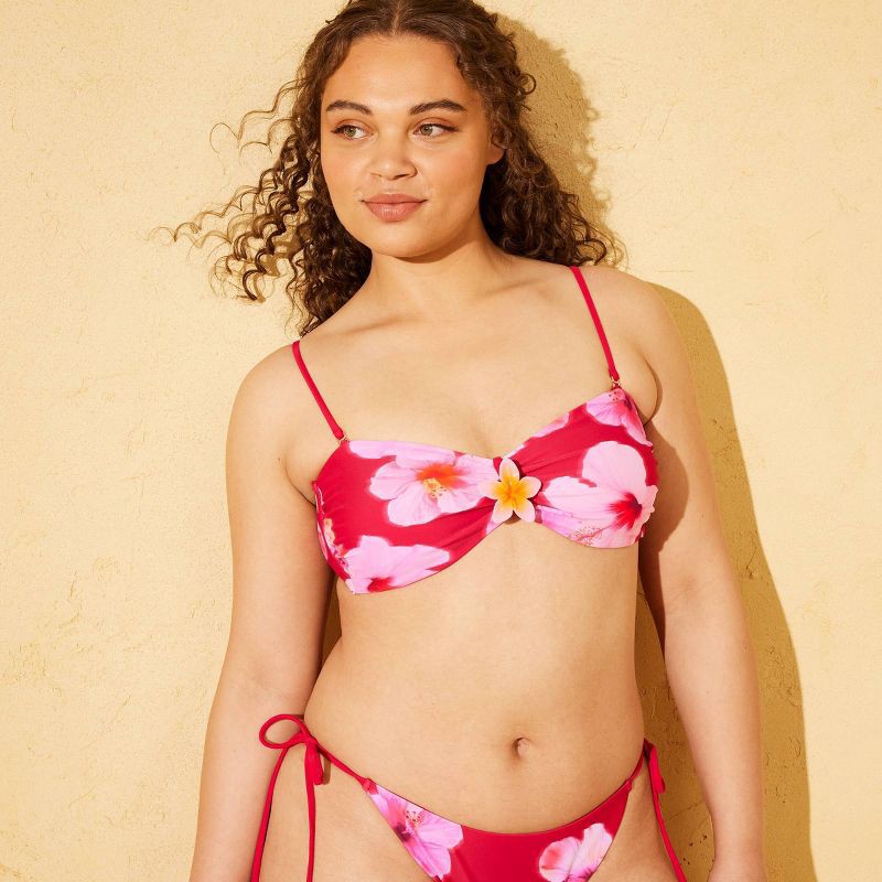 Bandeau bikini top from Wild Fable™ adorned with a burgundy floral print and accented with a yellow flower brooch on the center front. Crafted from nylon-spandex blend fabric and 100% recycled polyest…