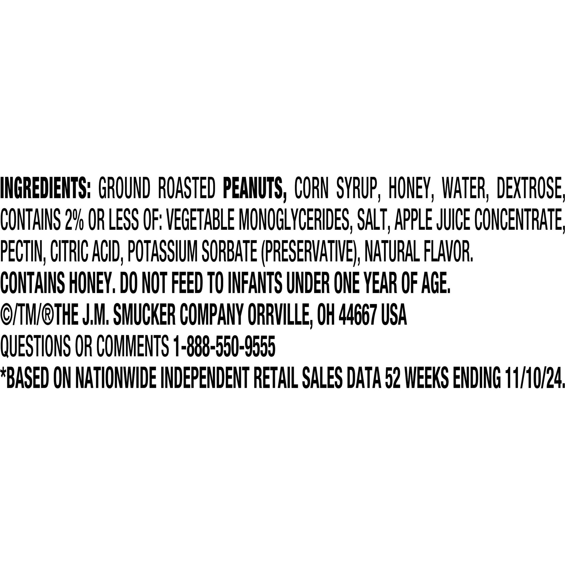 Ground Roasted Peanuts\, Corn Syrup\, Honey\, Water\, Dextrose\, Contains 2% or Less of: Vegetable Monoglycerides\, Salt\, Apple Juice Concentrate\, Pectin\, Citric Acid\, Potassium Sorbate (Preservat…