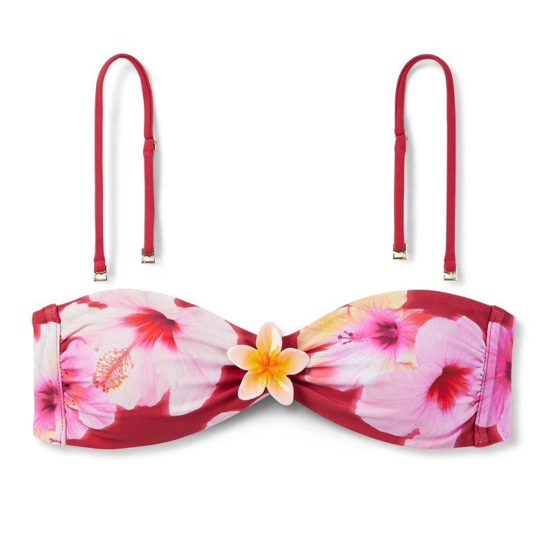 Bandeau bikini top from Wild Fable™ adorned with a burgundy floral print and accented with a yellow flower brooch on the center front. Crafted from nylon-spandex blend fabric and 100% recycled polyest…