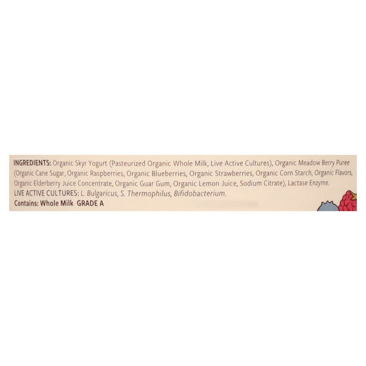 Organic Skyr Yogurt (Pasteurized Organic Whole Milk, Live Active Cultures), Organic Meadow Berry Puree (Organic Cane Sugar, Organic Raspberries, Organic Blueberries, Organic Strawberries, Organic Corn…