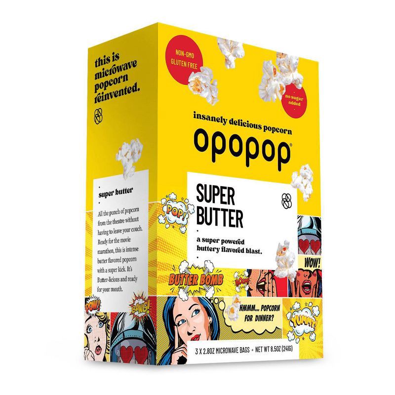 - 3 sharable bags. Box includes 3 Opopop Super Butter microwave popcorn bags to share.