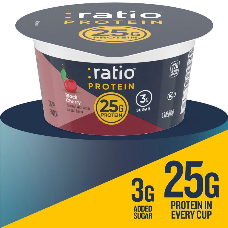 - CONTAINS: One 5.3 oz cup of :ratio Protein Black Cherry Flavored Yogurt Cultured Dairy Snack