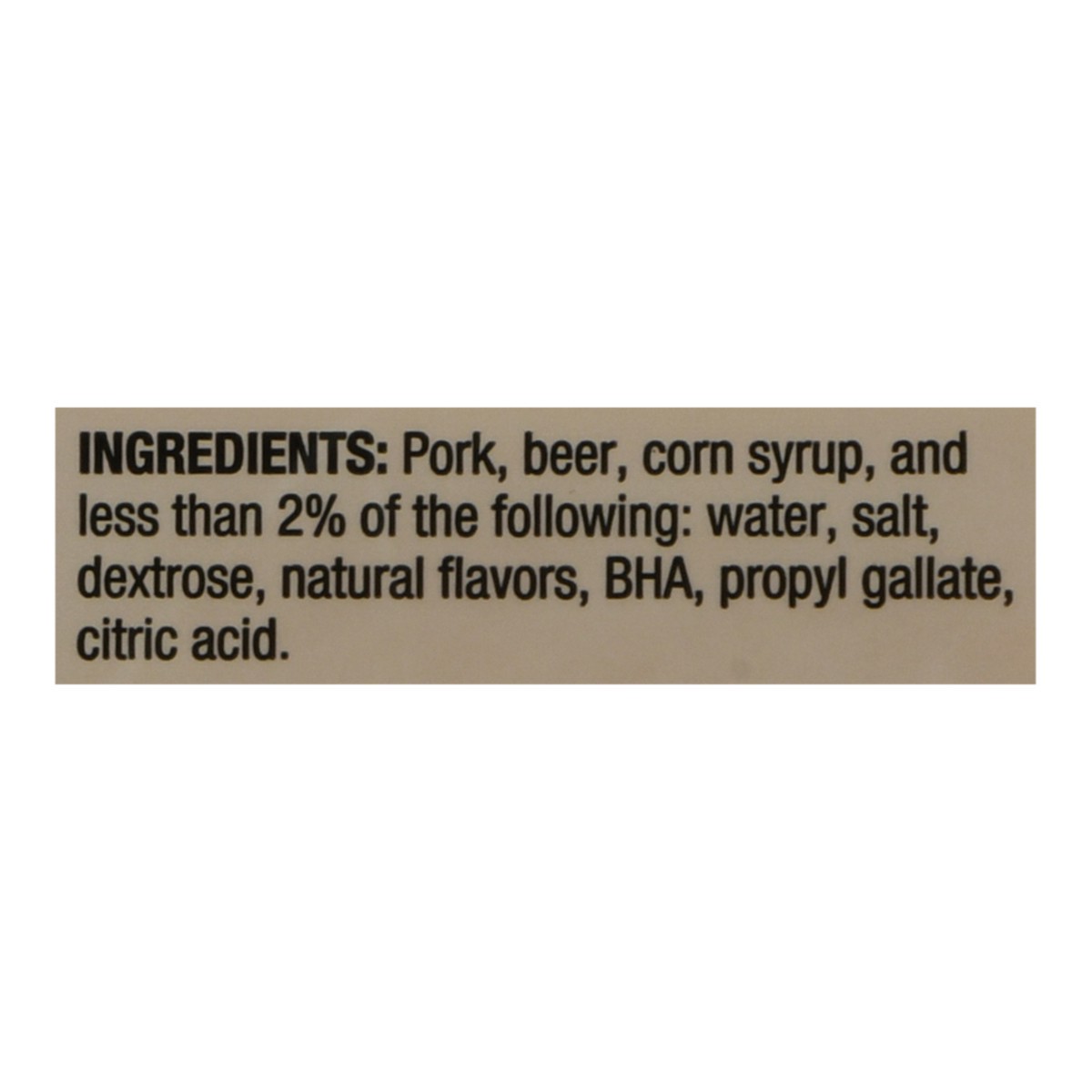 Pork, Beer, Corn Syrup, and Less than 2% of the Following: Water, Salt, Dextrose, Natural Flavors, BHA, Propyl Gallate, Citric Acid.
