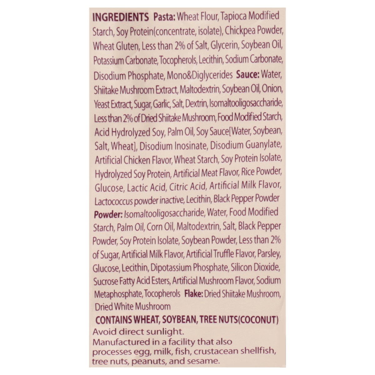 Contains: wheat, soybean, tree nuts (coconut). manufactured in a facility that also processes egg, milk, fish, crustacean shellfish, tree nuts, peanuts, and sesame.