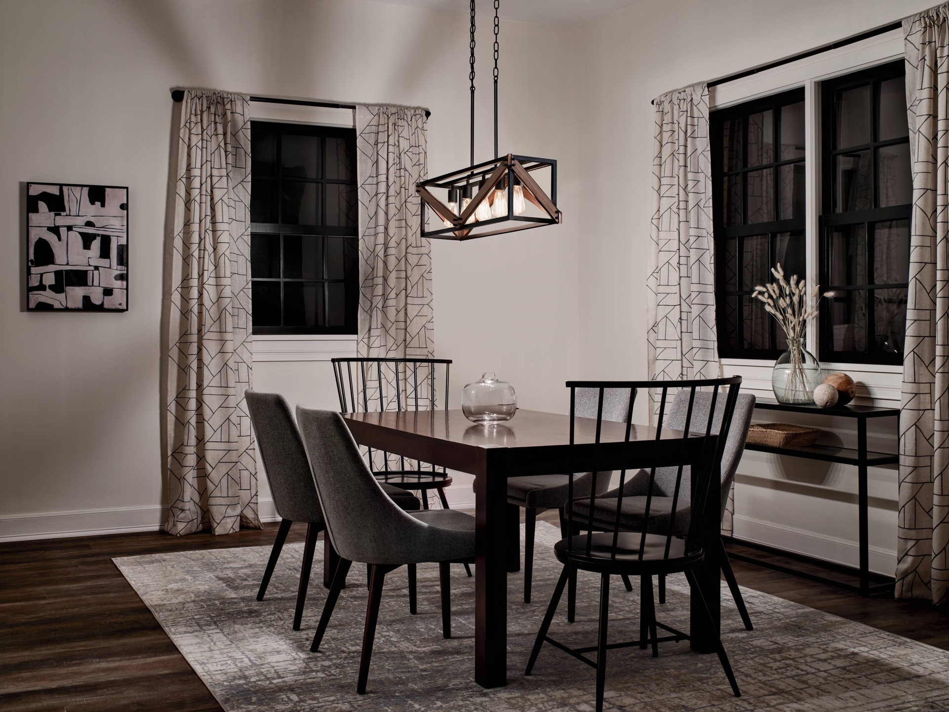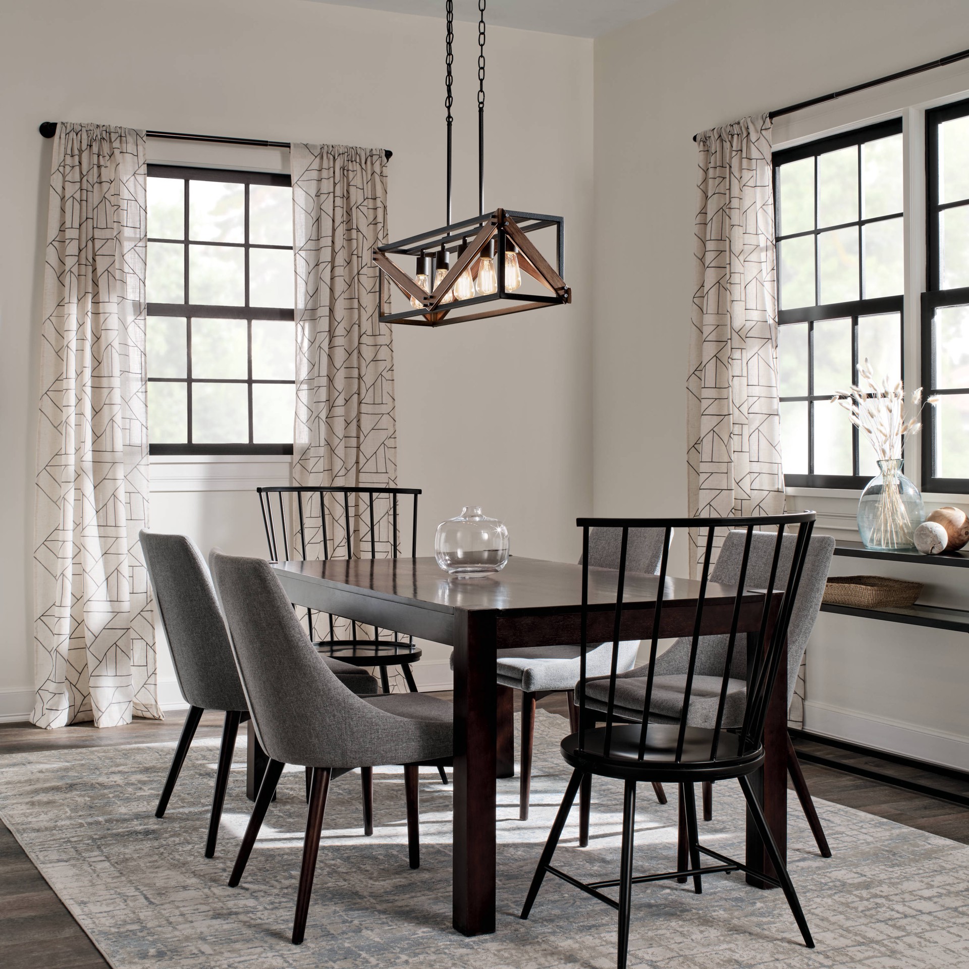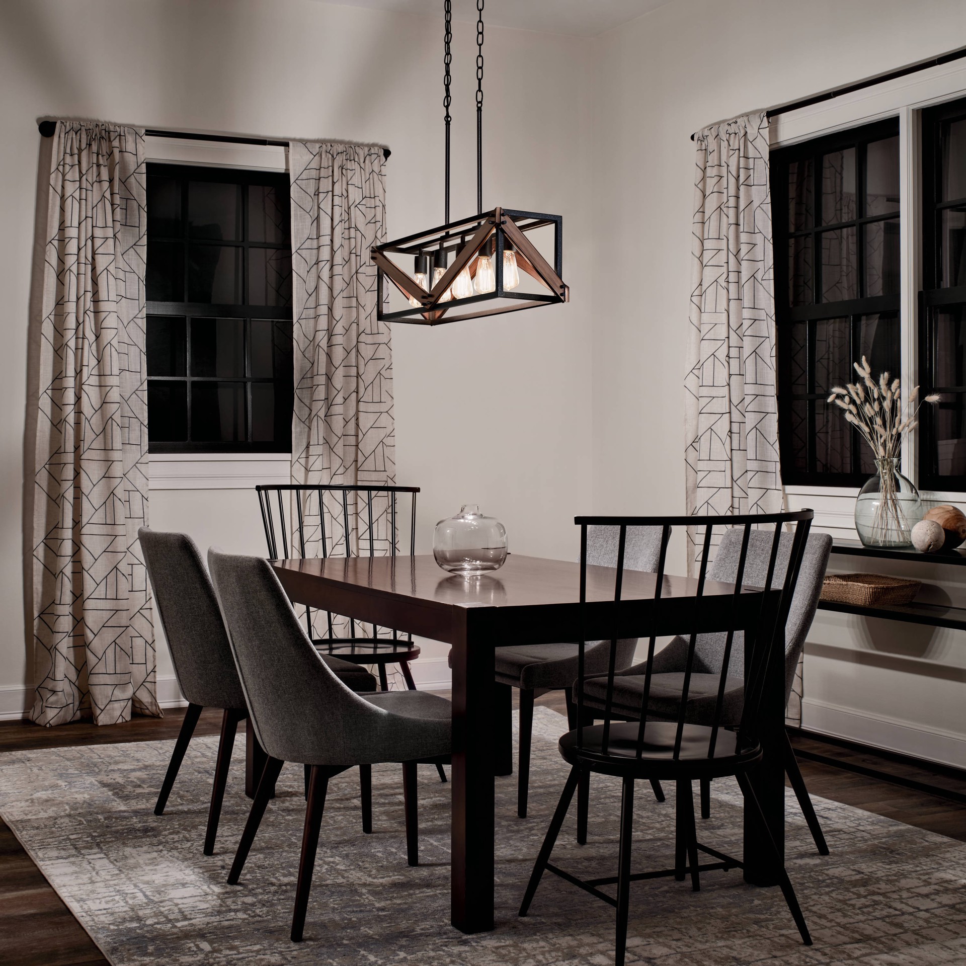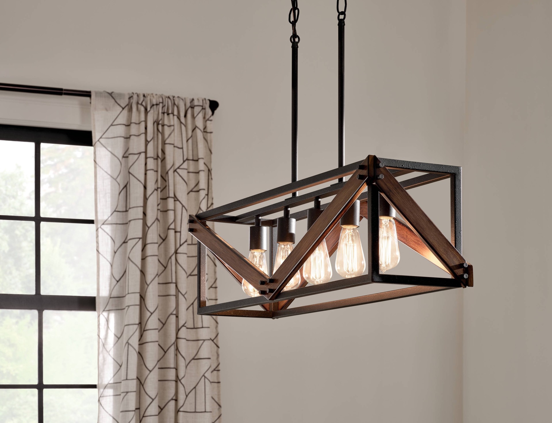 Kichler Barrington 5 -Light Distressed Black and Wood Tone Farmhouse Cage Linear Large Hanging Kitchen Island Light