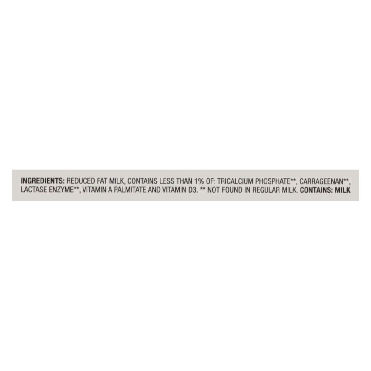 Reduced Fat Milk, Tricalcium Phosphate (Not Found in Regular Milk), Carrageenan (Not Found in Regular Milk), Lactase Enzyme (Not Found in Regular Milk), Vitamin A Palmitate and Vitamin D3.