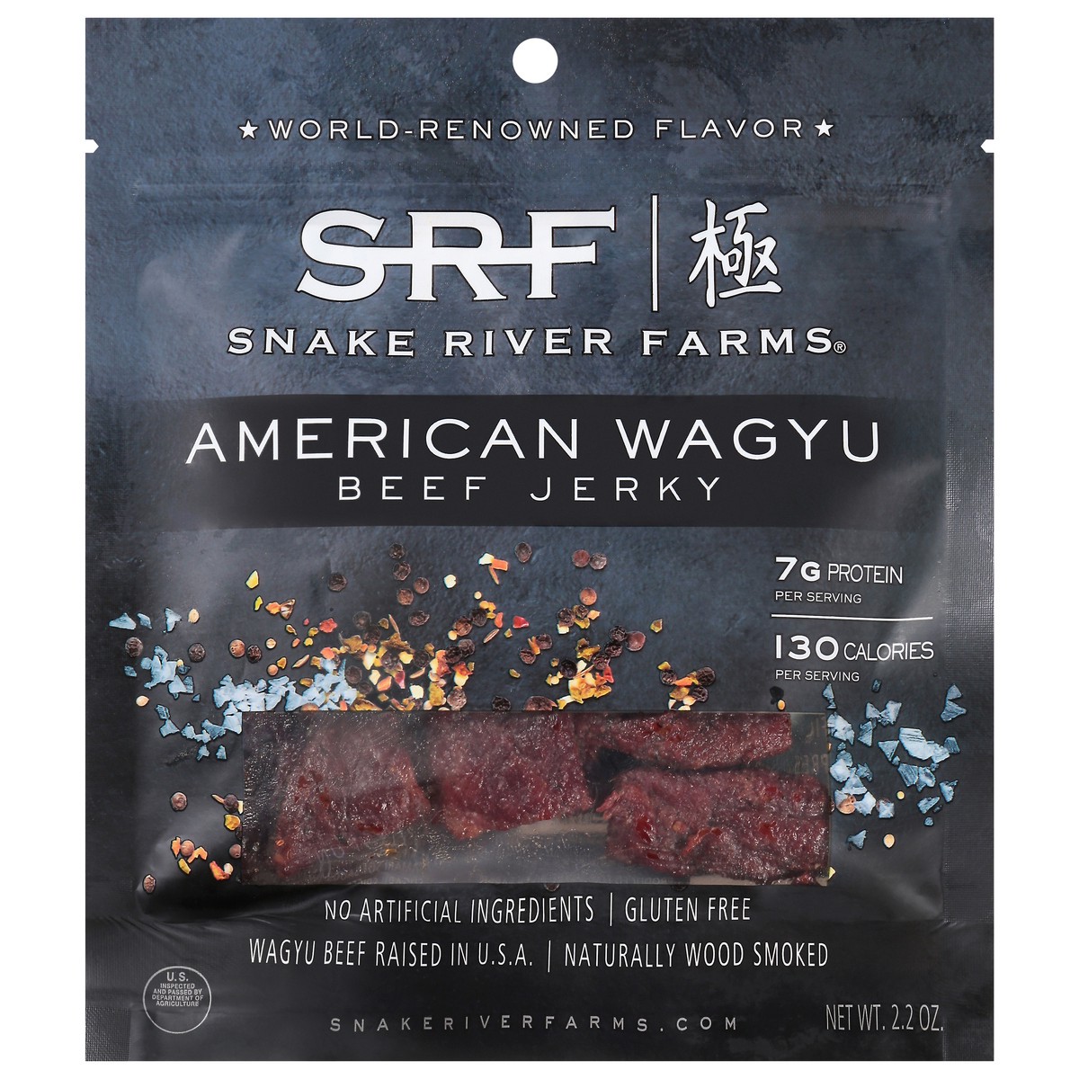 Naturally wood smoked 7 g protein per serving. 130 calories per serving. Gluten free. World-renowned flavor. No artificial ingredients. Snake river farms. Elevating the classic jerky. Snake River Farm…