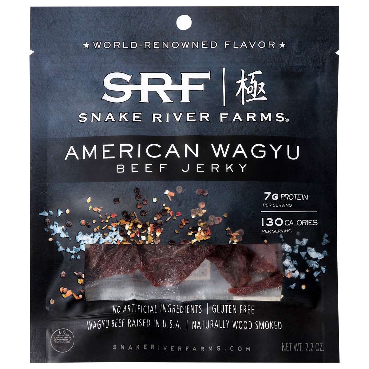 Naturally wood smoked 7 g protein per serving. 130 calories per serving. Gluten free. World-renowned flavor. No artificial ingredients. Snake river farms. Elevating the classic jerky. Snake River Farm…