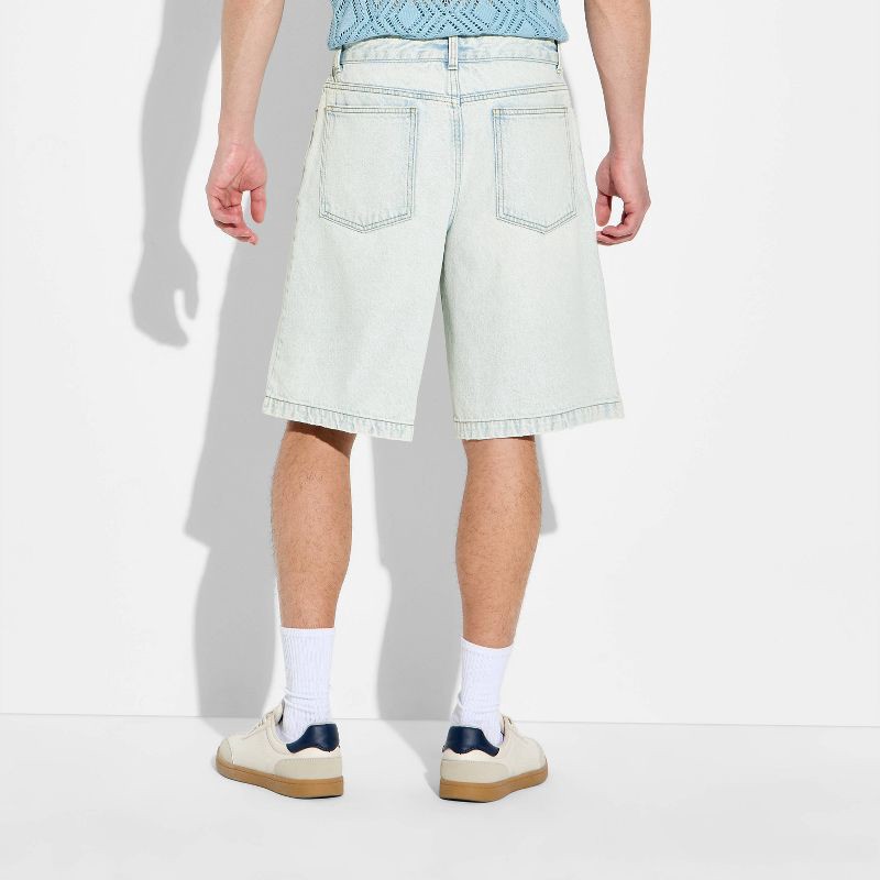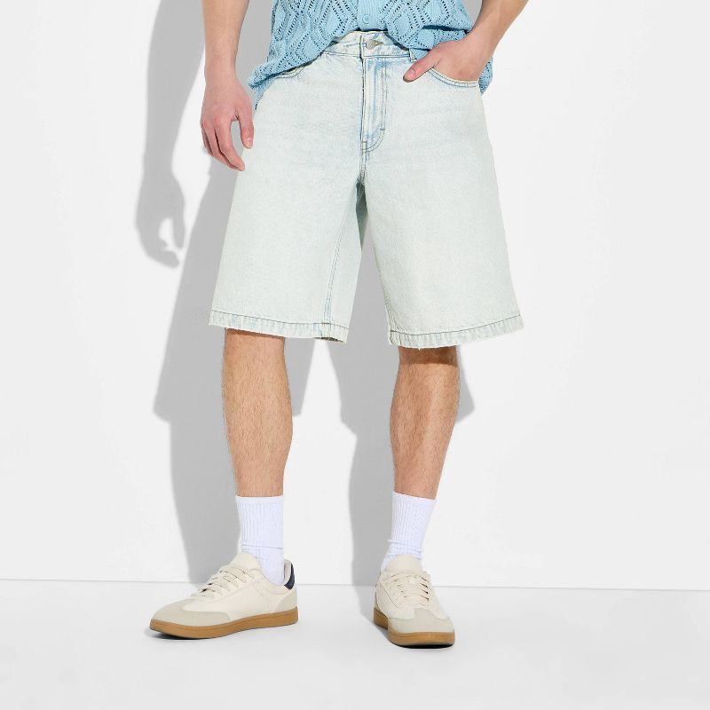 At-knee denim shorts in blue designed in a loose-fit silhouette. Made from cotton-recycled cotton blend fabric for all-day comfort. Sport a mid-rise cut and a fly button and zipper closure. Side and b…