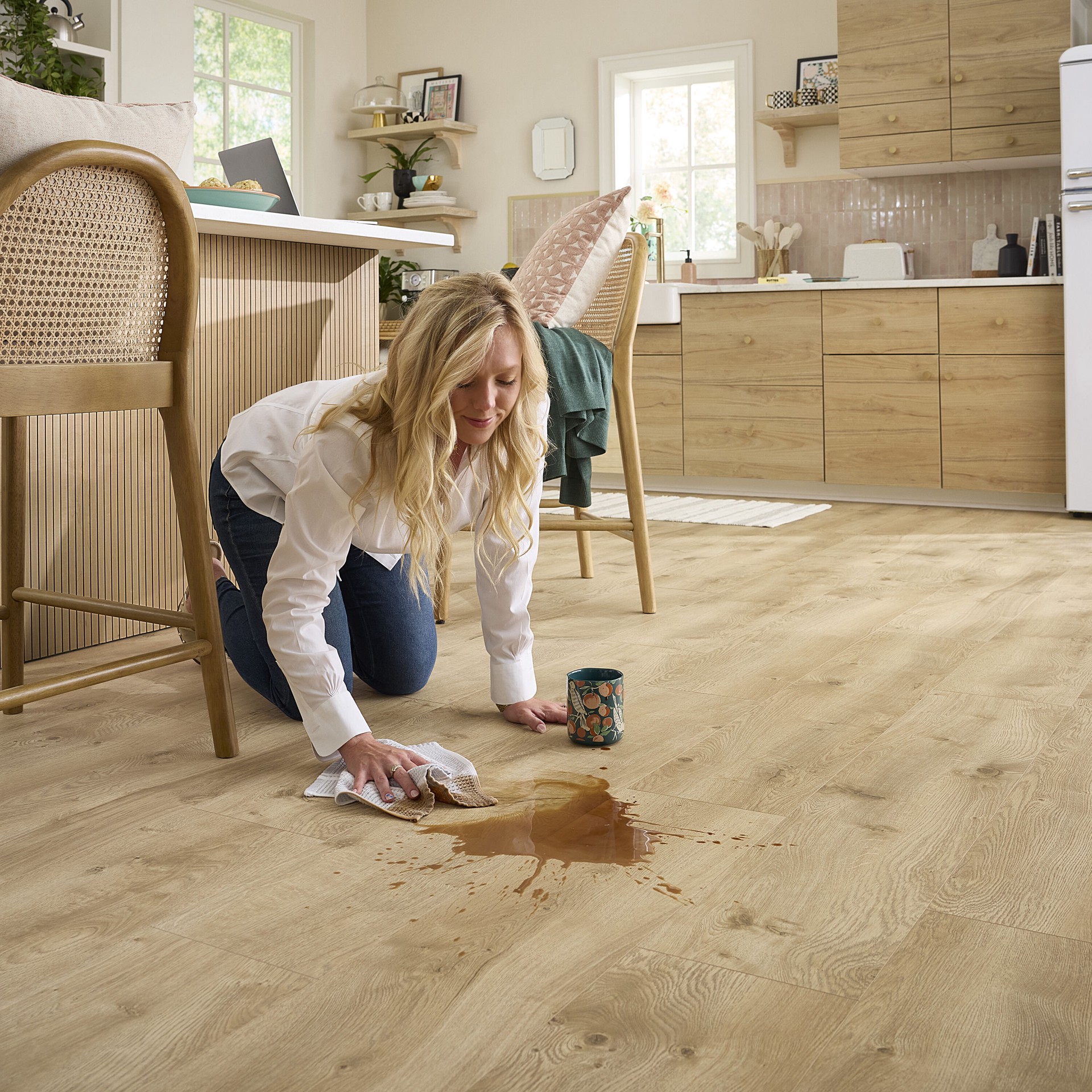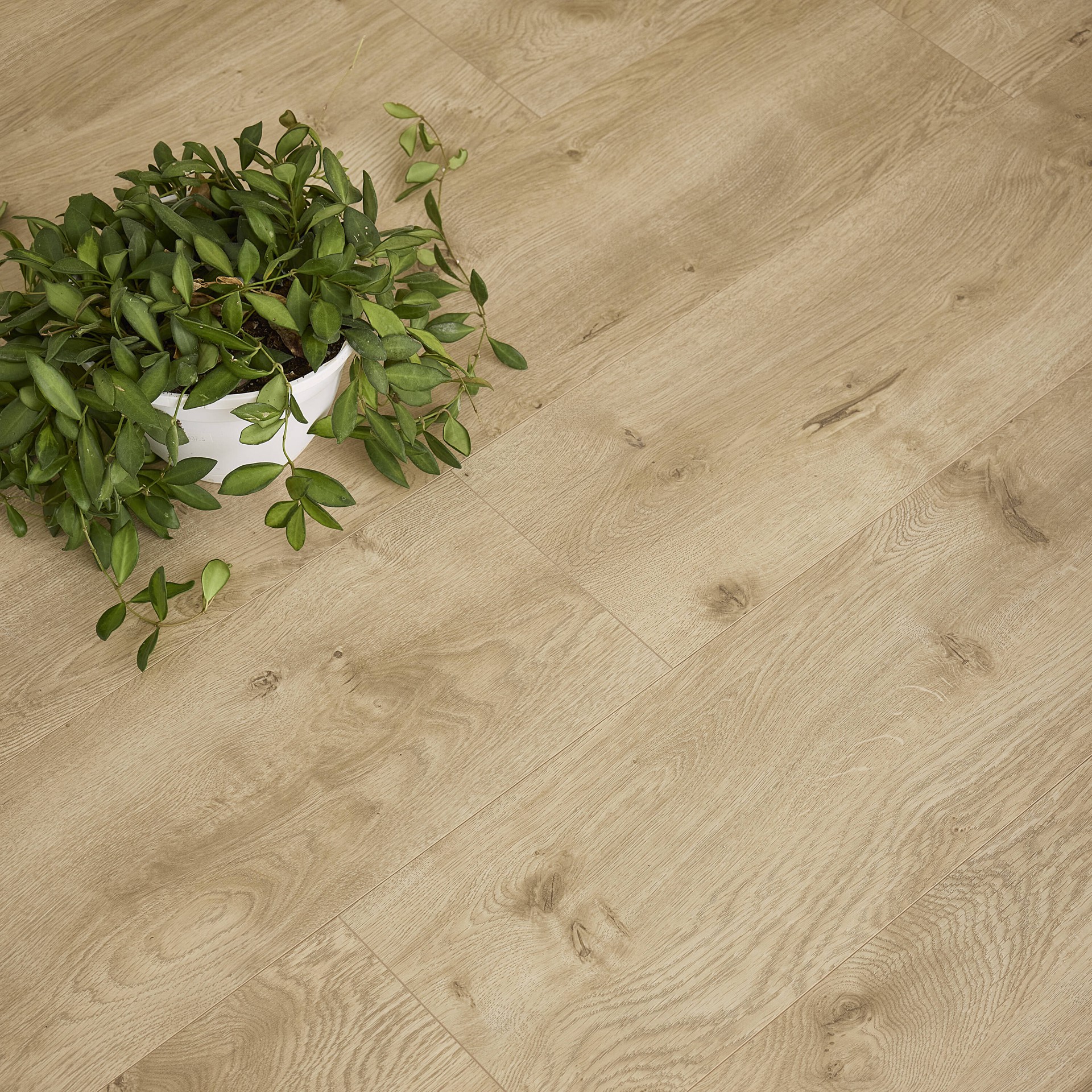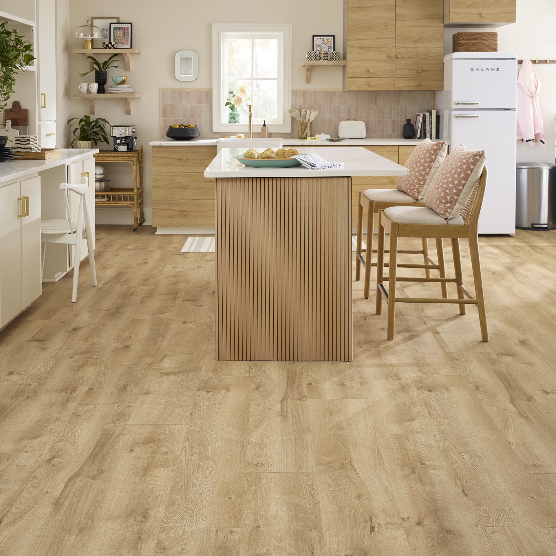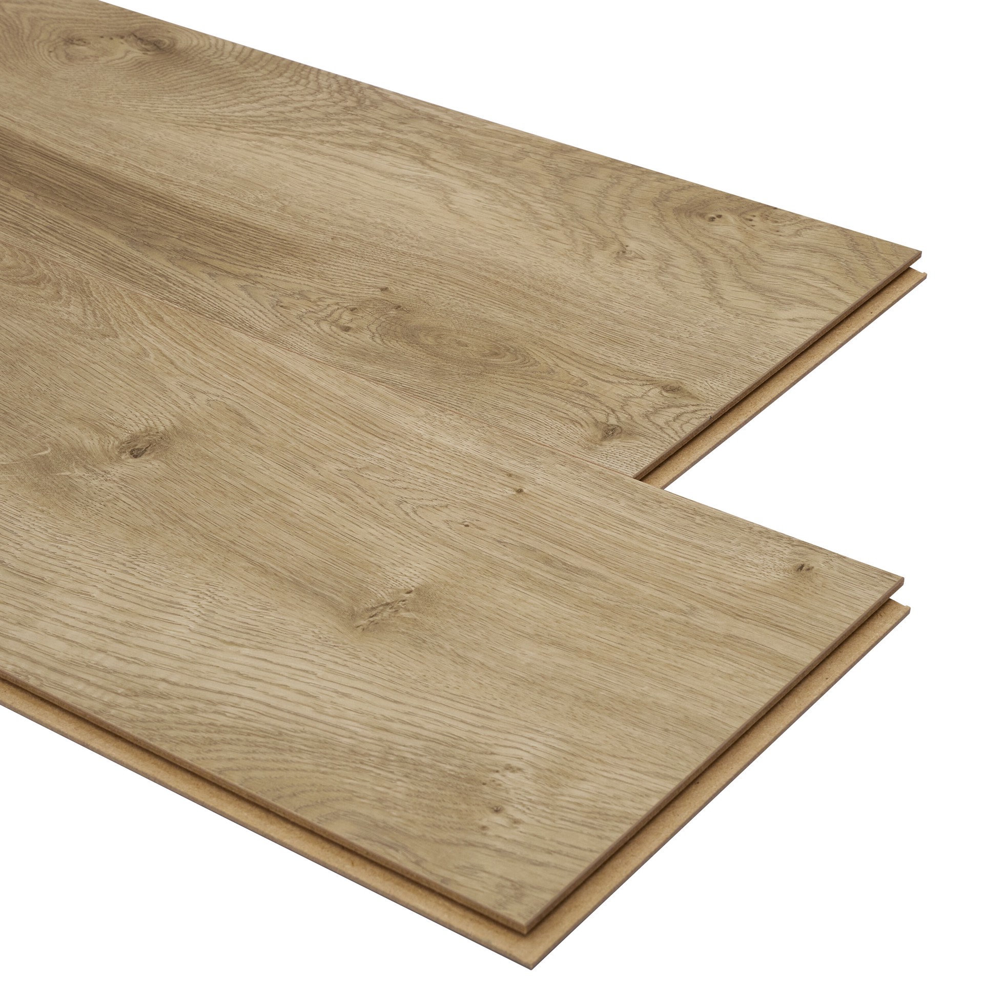 Quick-Step Studio® XL Birchwood Bay Oak wide plank laminated wood flooring is a golden natural honey oak with a warm amber glow, a textured surface, and a matte sheen finish replicating the look of na…