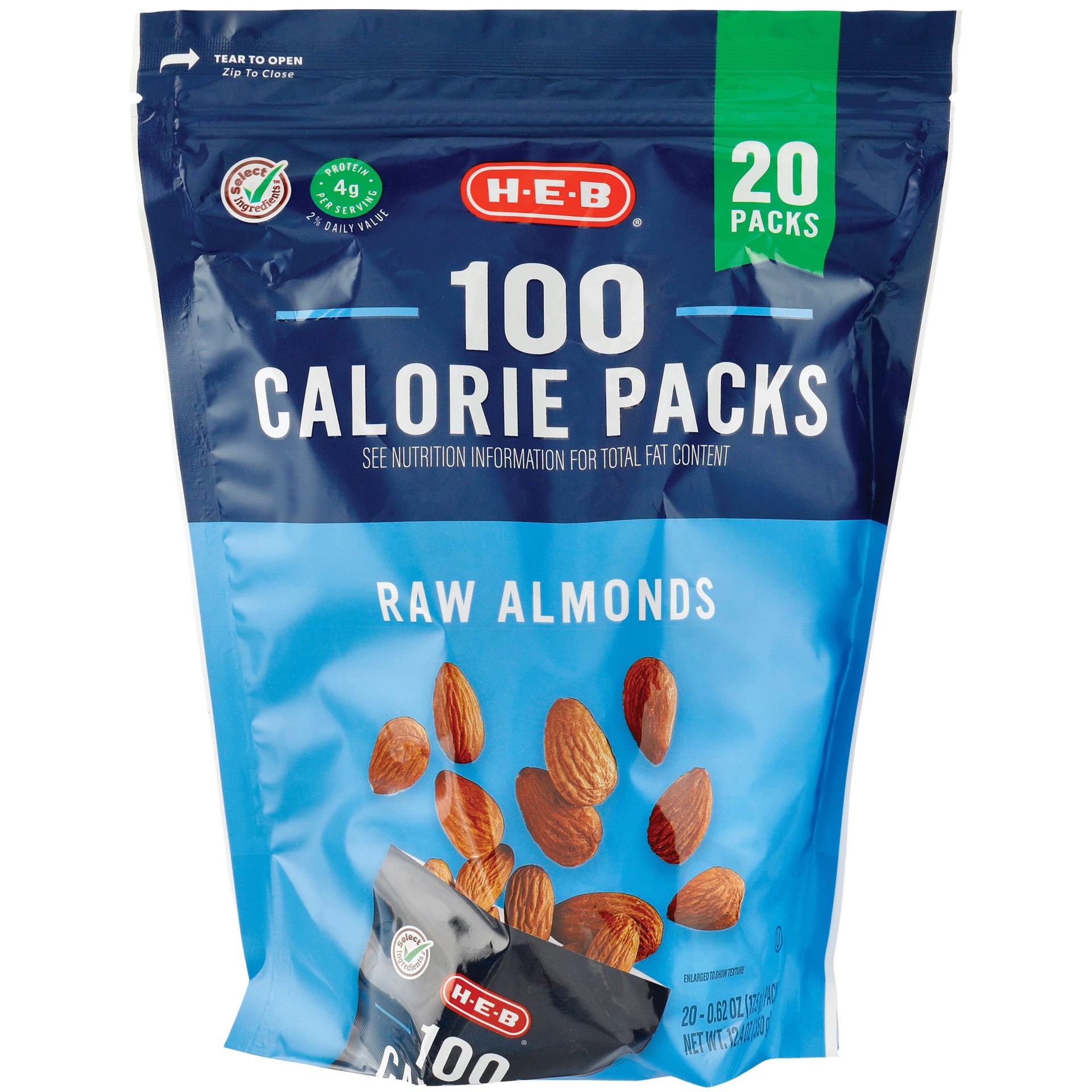 These H-E-B 100 Calorie Snack Packs of raw almonds are easy to enjoy on busy, nutty days. Offering 4 grams of protein per serving, they're a tasty addition to your purse, desk drawer or anywhere that'…