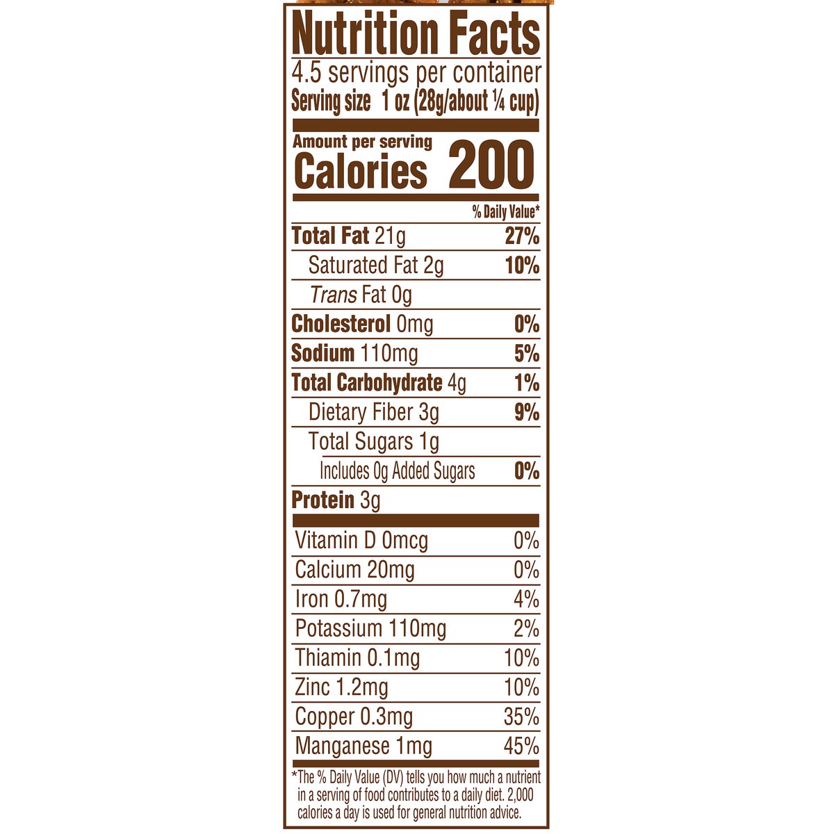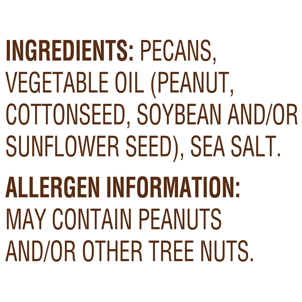 Pecans, Vegetable Oil (Peanut, Cottonseed, Soybean and/or Sunflower Seed), Sea Salt.
