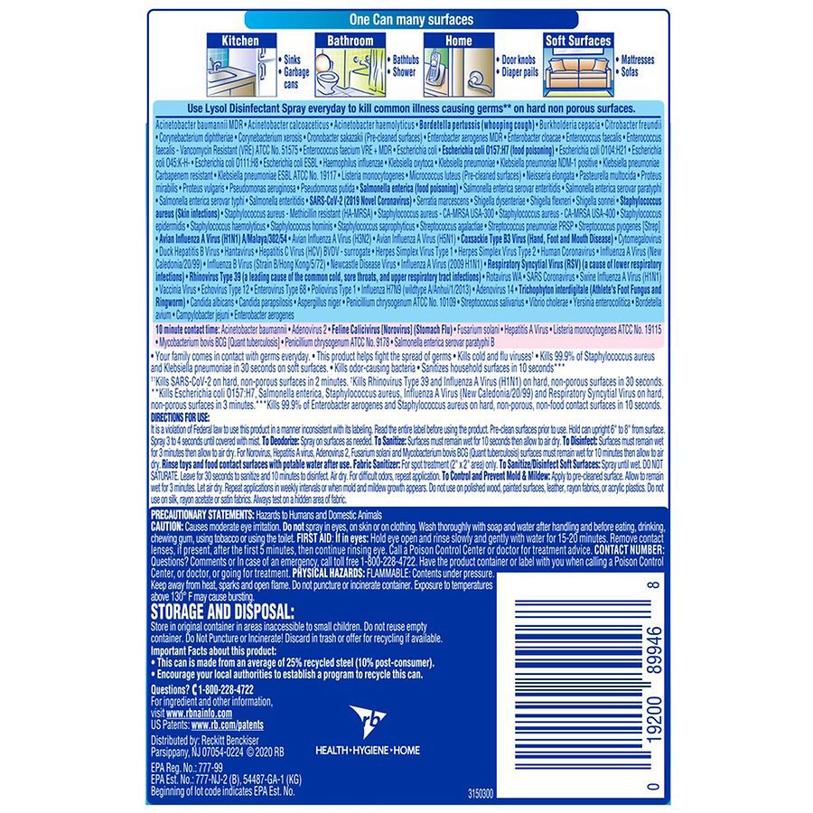 - DISINFECTING AND SANITIZING SPRAY: Lysol disinfects hard non-porous contact surfaces and sanitizes soft surfaces. This multi-purpose spray can be used in the home and kitchen