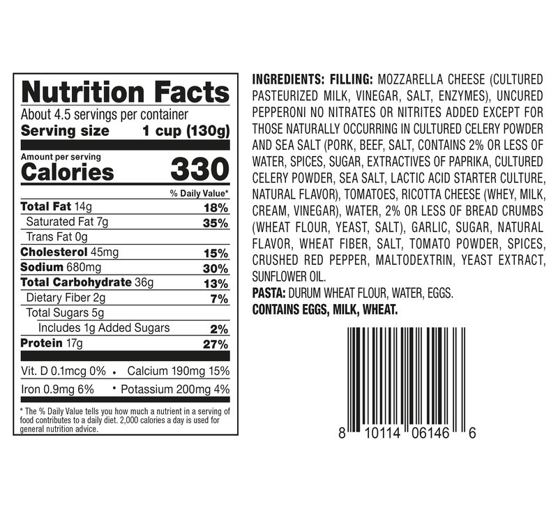 Uncured Pepperoni & Mozzarella Ravioli. Uncured pepperoni & stringy mozzarella cheese wrapped in thin dough. Packed with 17 grams of protein per serving. Made with no artificial flavors, no artificial…