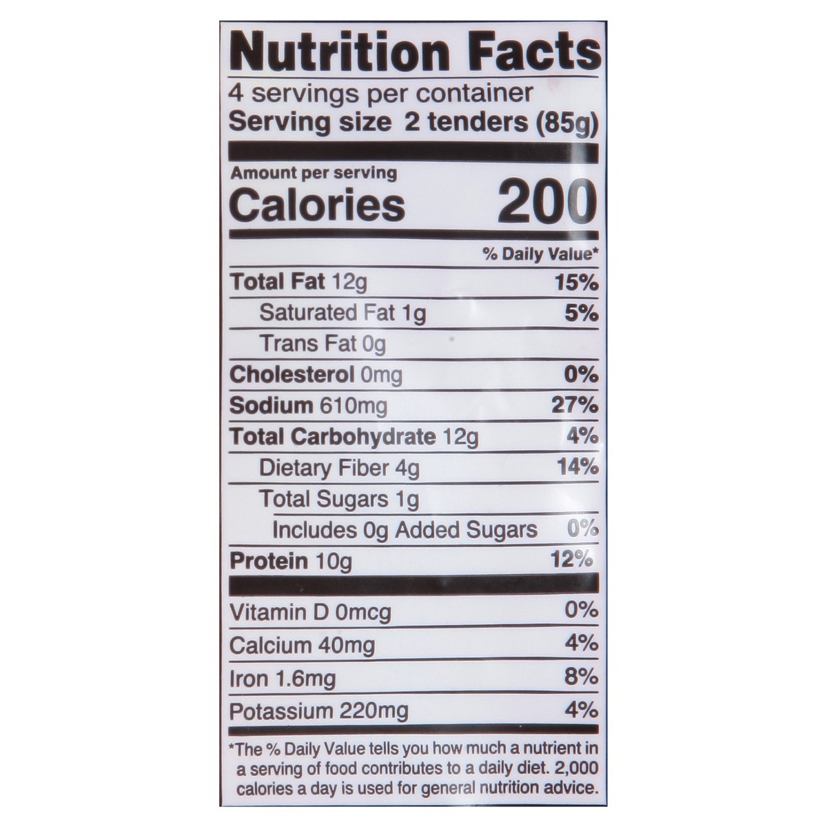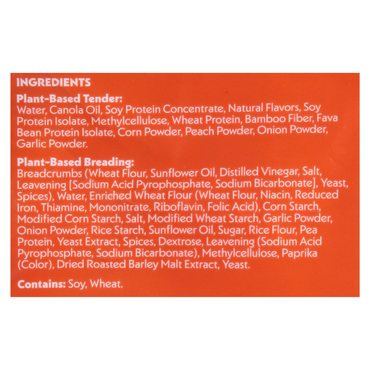 Plant-Based Tender: Water, Canola Oil, Soy Protein Concentrate, Natural Flavors, Soy Protein Isolate, Methylcellulose, Wheat Protein, Bamboo Fiber, Fava Bean Protein Isolate, Corn Powder, Peach Powder…