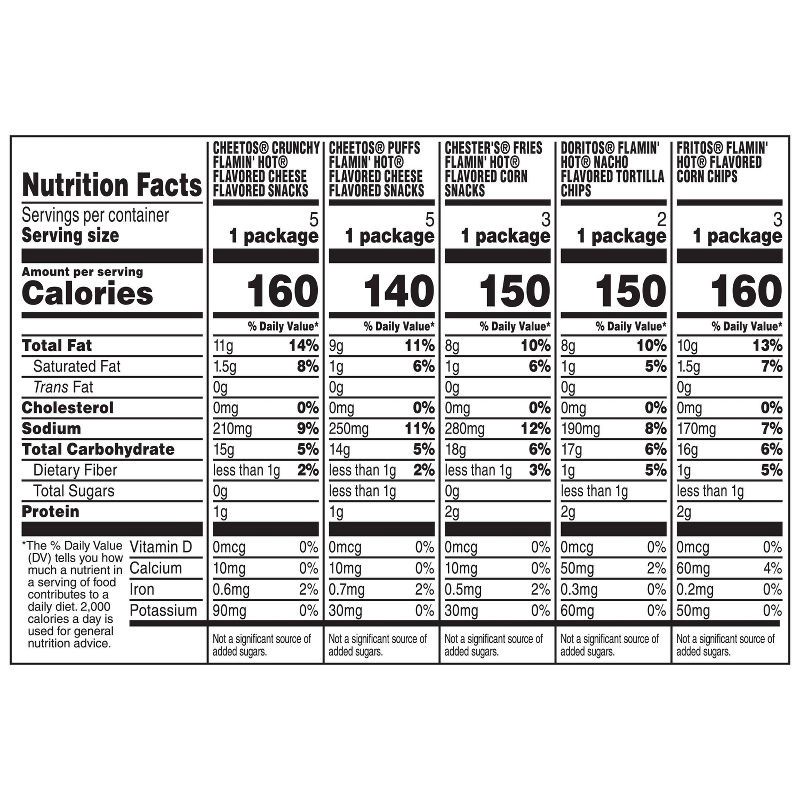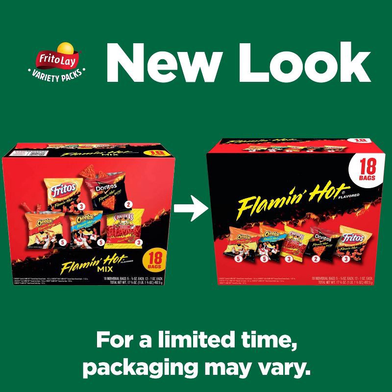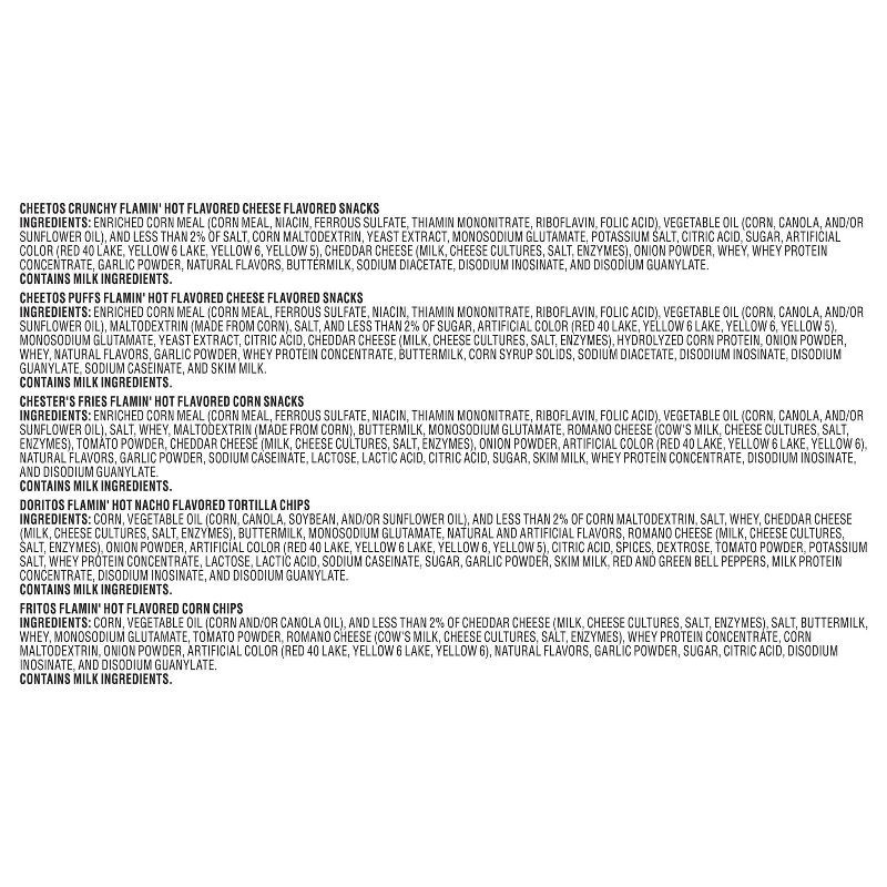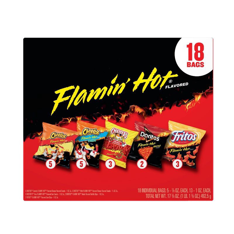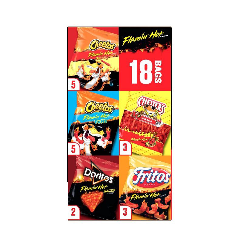 - 18 count mix includes Flamin' Hot flavored Frito-Lay snacks, Cheetos Flamin' Hot Crunchy, Doritos Flamin' Hot Nacho, Chester's Flamin' Hot Fries, Cheetos Flamin' Hot Puffs, and Fritos Flamin' Hot