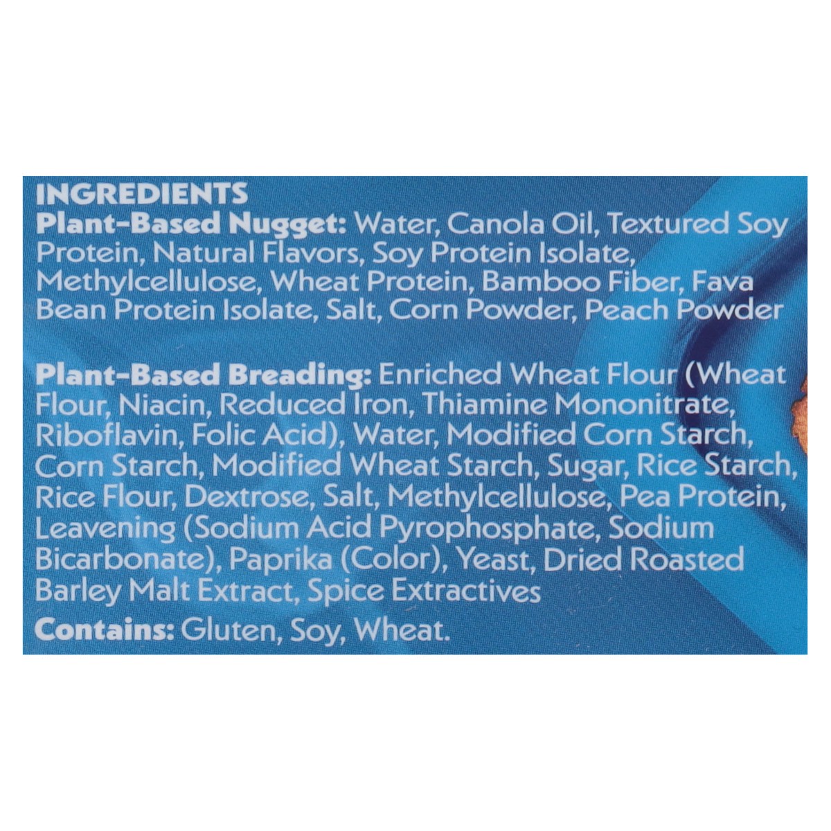 Plant-Based Nuggets: Water, Canola Oil, Soy Protein Concentrate, Natural Flavors, Soy Protein Isolate, Methylcellulose, Contains Less than 2% of: Peach Powder, Corn Powder, Bamboo Fiber, Fava Bean Pro…