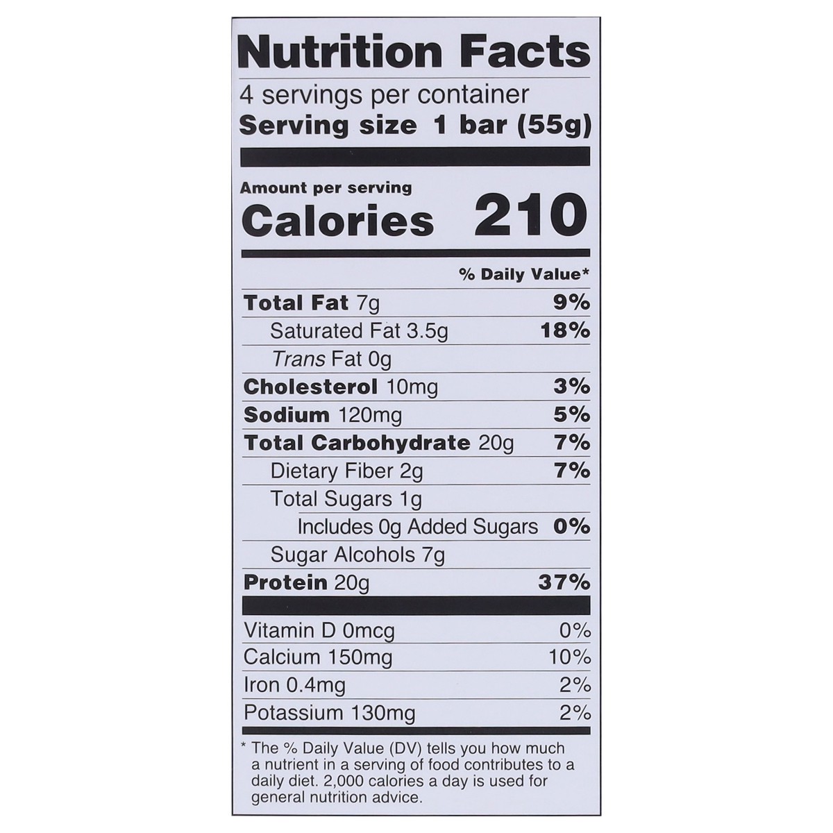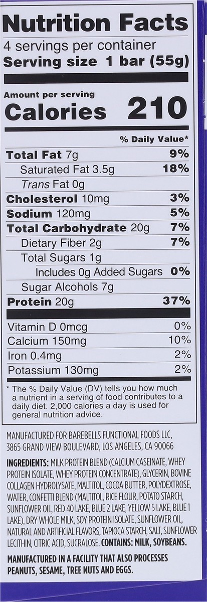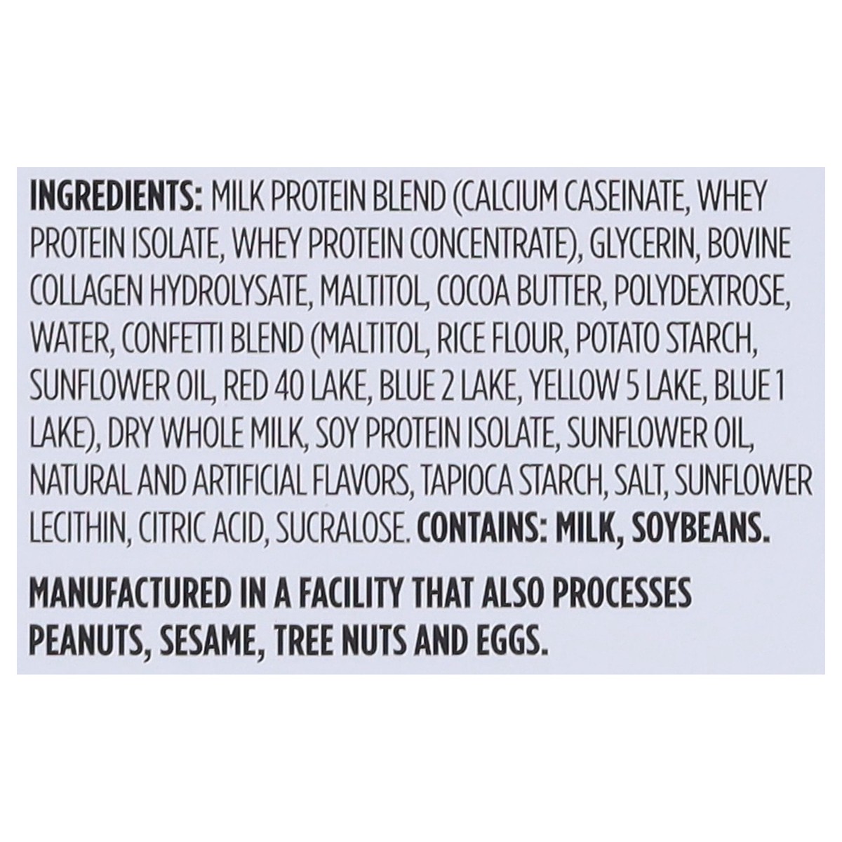 Milk Protein Blend (Calcium Caseinate, Whey Protein Isolate, Whey Protein Concentrate), Glycerin, Bovine Collagen Hydrolysate, Maltitol, Cocoa Butter, Polydextrose, Water, Confetti Blend (Maltitol, Ri…
