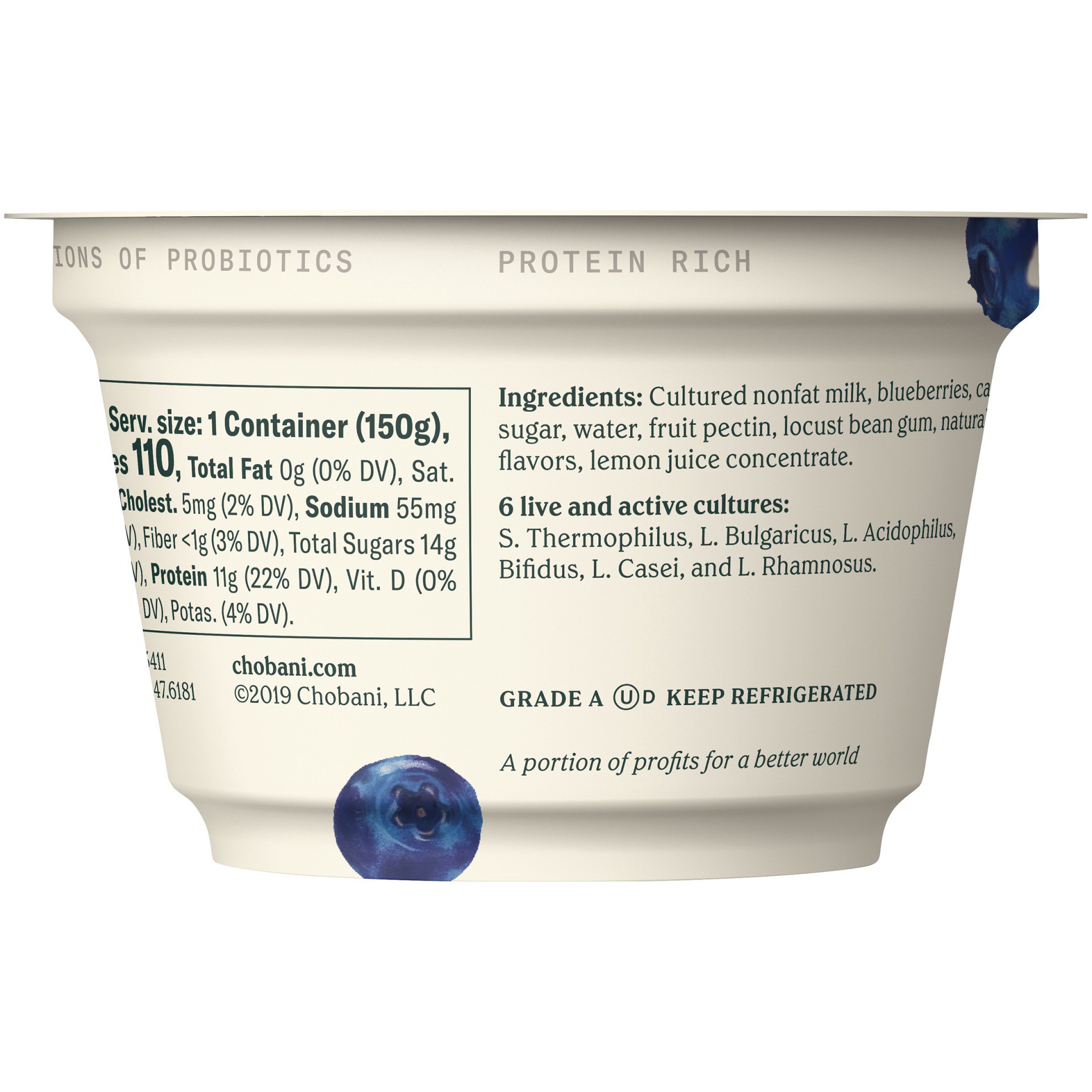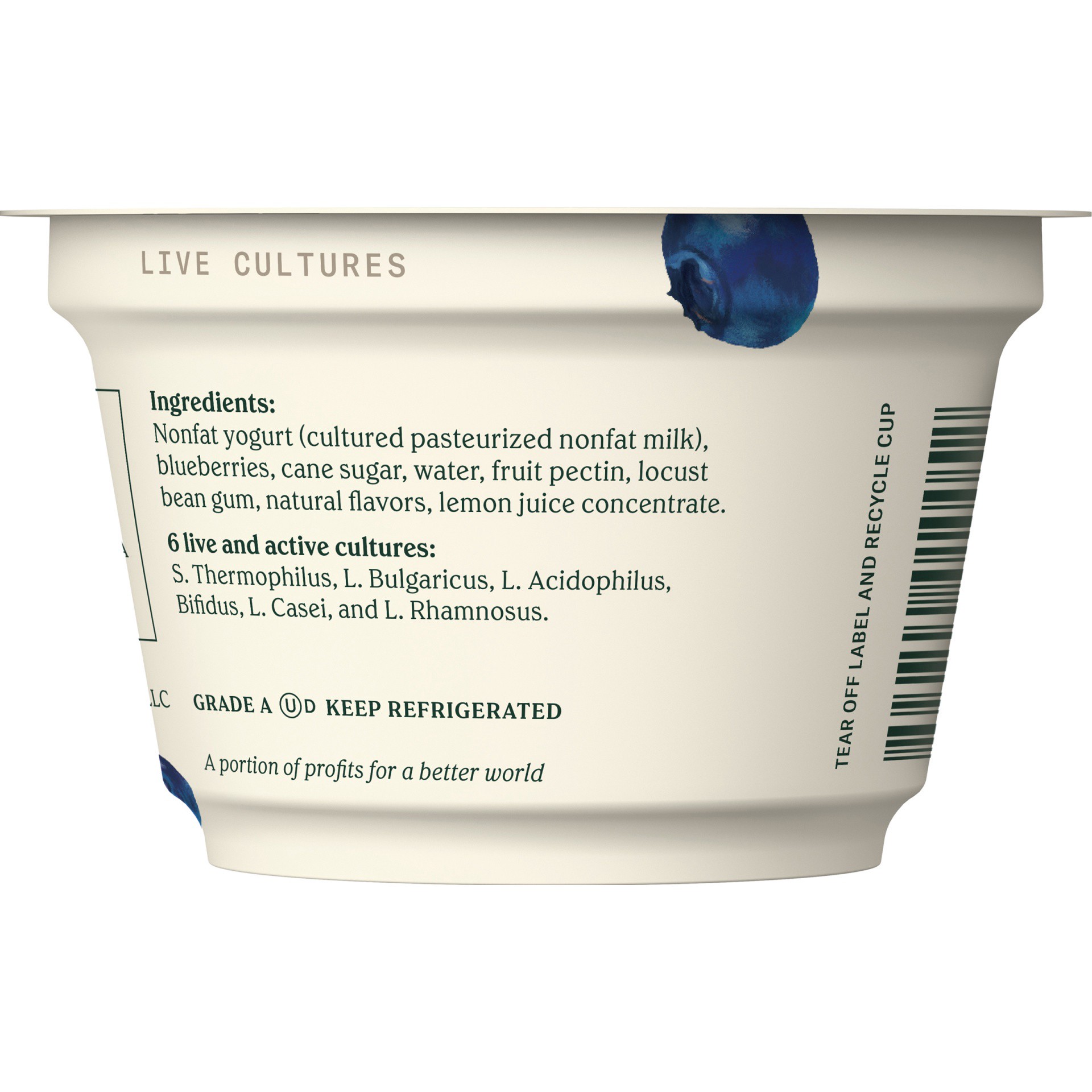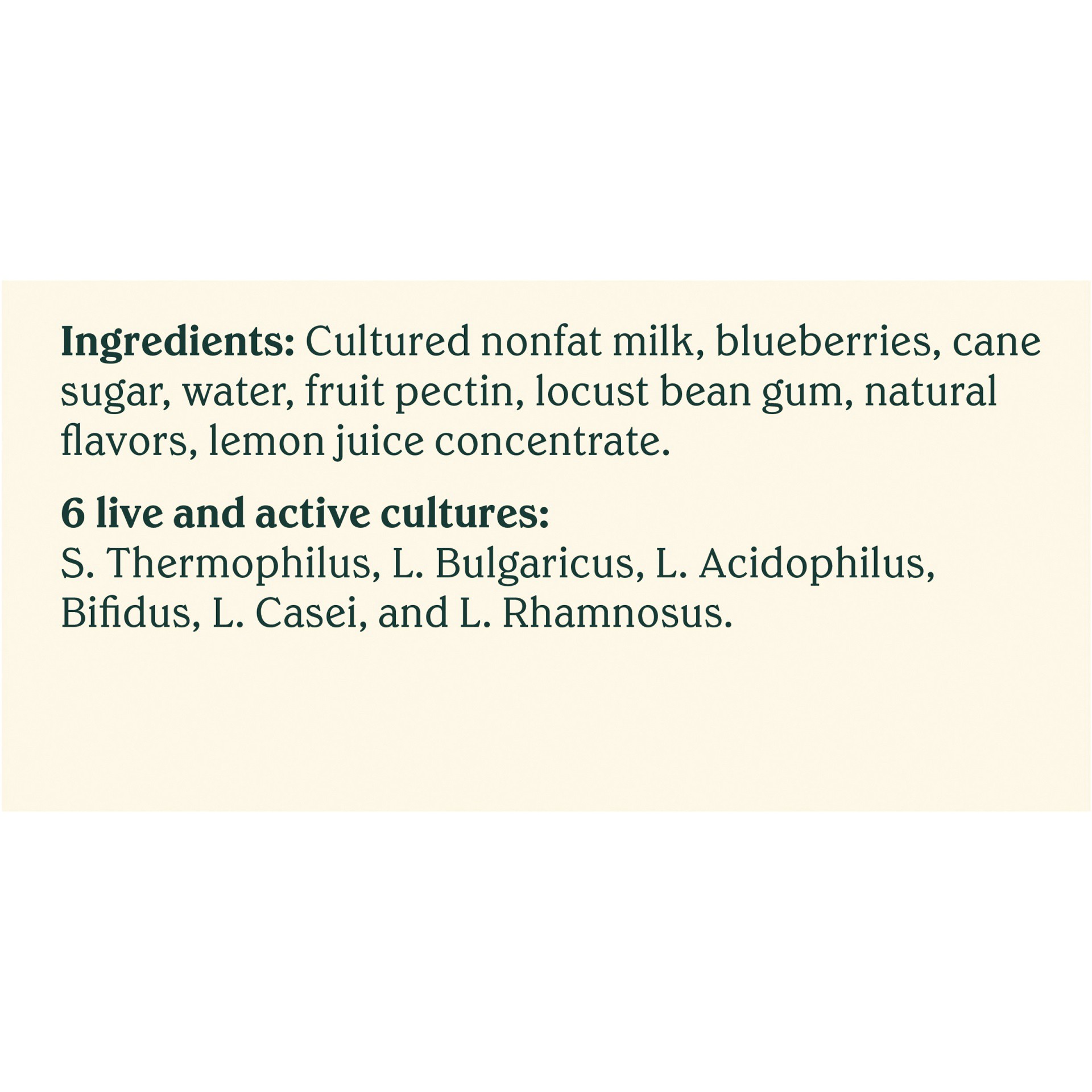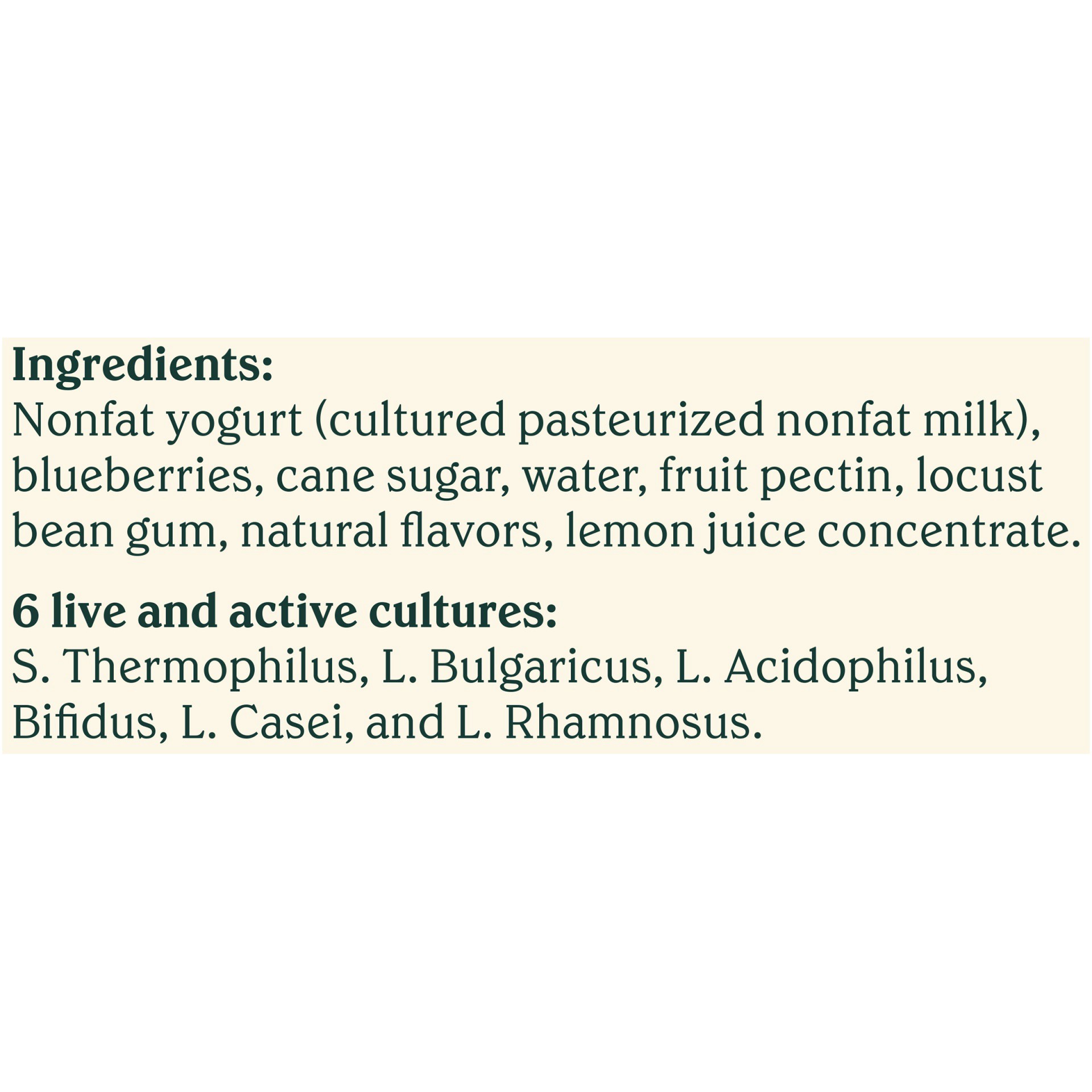 Nonfat Yogurt (Cultured Pasteurized Nonfat Milk), Blueberries, Cane Sugar, Water, Fruit Pectin, Locust Bean Gum, Natural Flavors, Lemon Juice Concentrate.\n6 Live and Active Cultures: S. Thermophilus,…