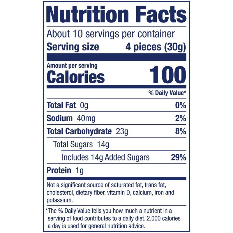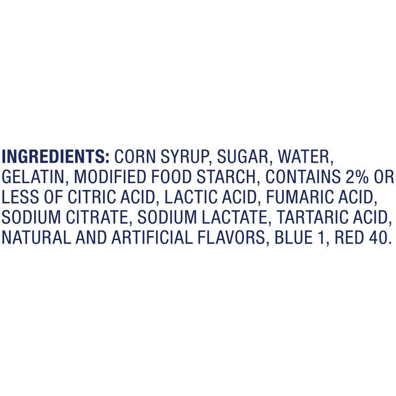 Corn Syrup, Sugar, Water, Gelatin, Modified Food Starch, Contains 2% or Less of Citric Acid, Lactic Acid, Fumaric Acid, Sodium Citrate, Sodium Lactate, Tartaric Acid, Natural and Artificial Flavors, B…