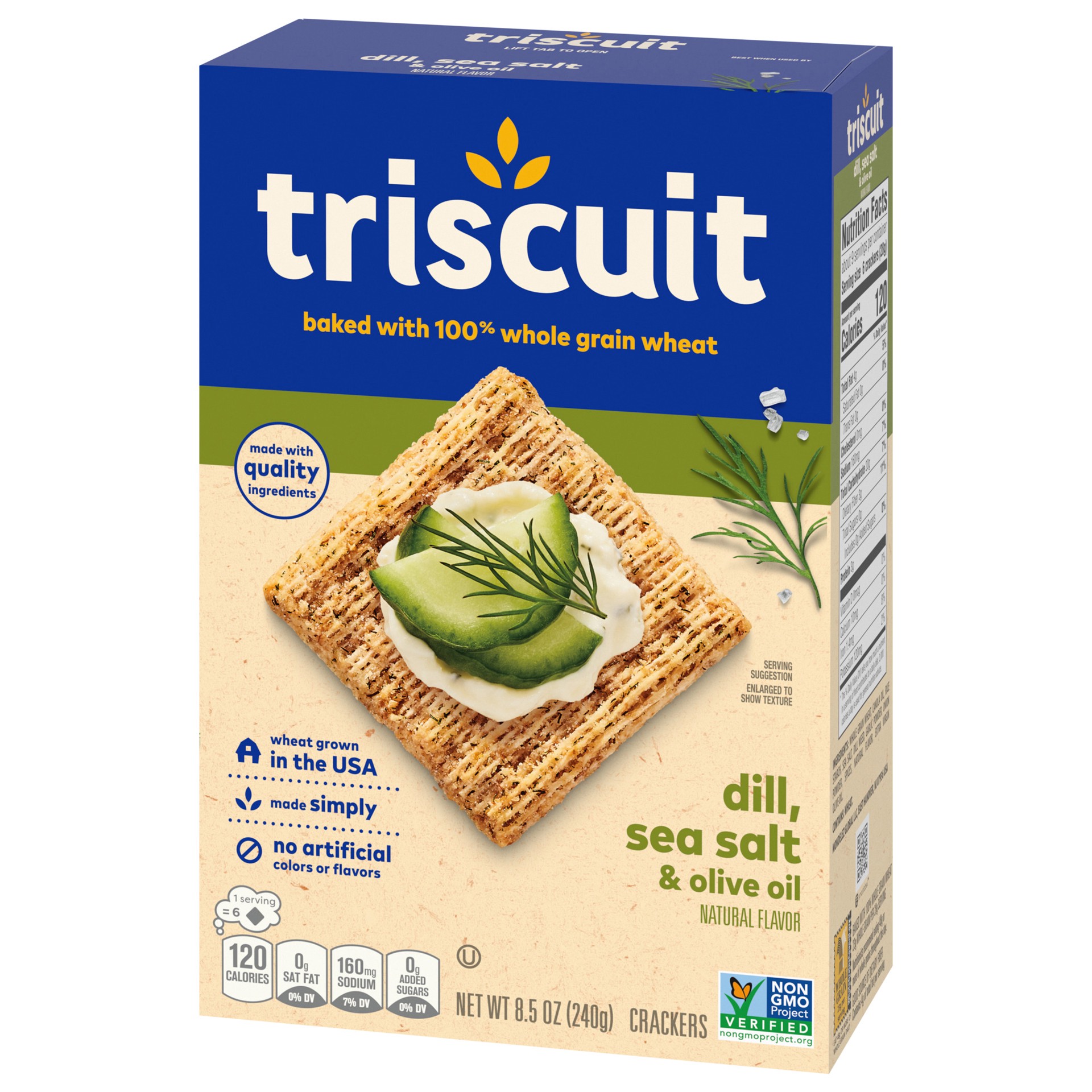 Triscuit Dill, Sea Salt & Olive Oil Whole Grain Wheat Crackers are made simply with quality ingredients. Baked to perfection, these snack crackers use 100% whole grain wheat proudly grown in the USA a…