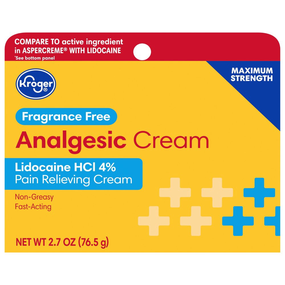 Use Kroger Analgesic + Lidocaine Cream for temporary relief of pain.Non-irritatingNon-greasyFast-actingOdor FreeProvides temporary relief of painContains 4% Lidocaine HCI