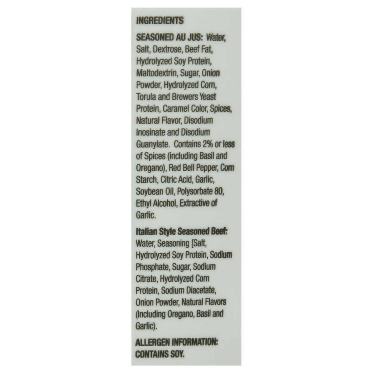 Seasoned Au Jus: Water, Salt, Dextrose, Beef Fat, Hydrolyzed Soy Protein, Maltodextrin, Sugar, Onion Powder, Hydrolyzed Corn, Torula and Brewers Yeast Protein, Caramel Color, Spices, Natural Flavor, D…