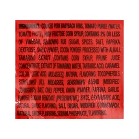 NATURAL SMOKE FLAVORING ADDED Ingredients: Cooked Pork Babyback Ribs, Tomato Puree (Water, Tomato Paste), High Fructose Corn Syrup, Contains 2% or less of Vinegar, Seasoning Rub (Sugar, Spices, Salt, …