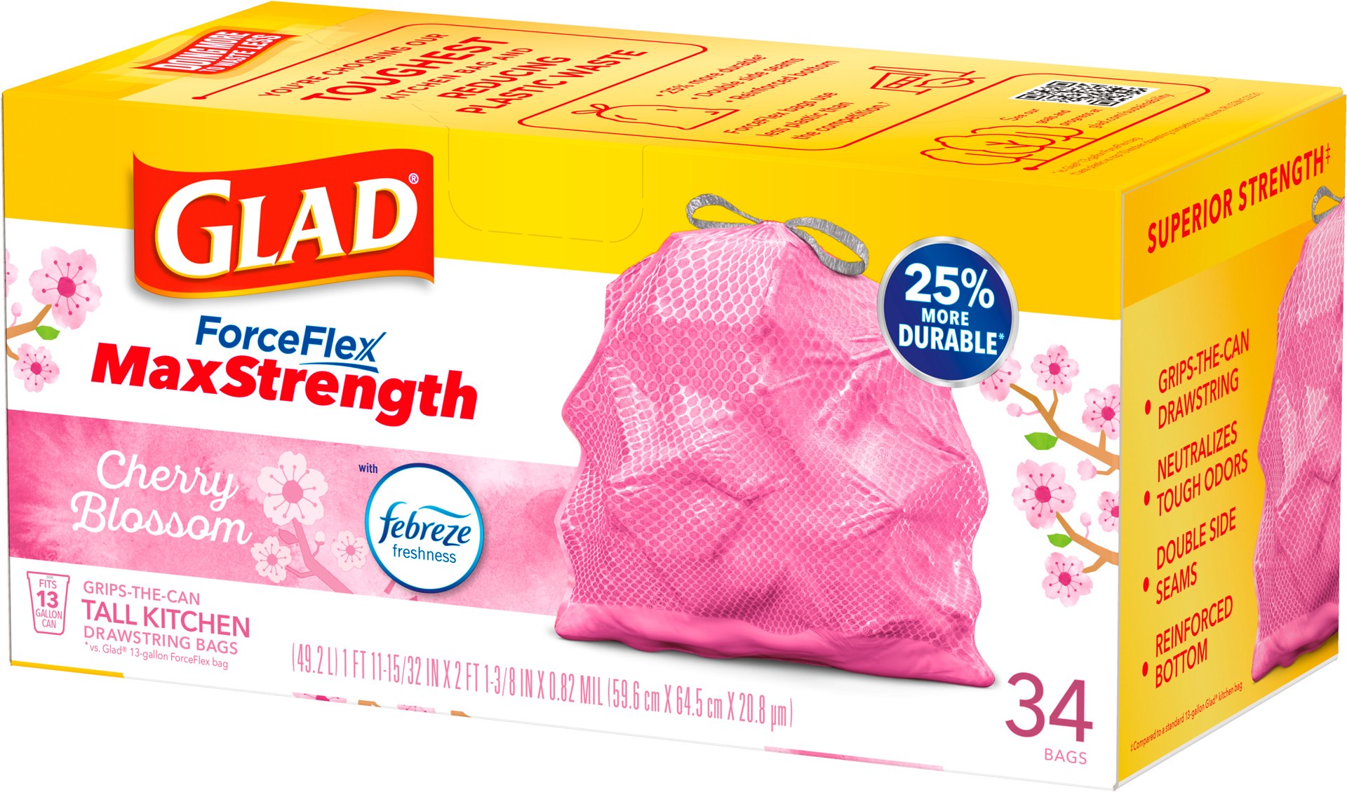 Glad ForceFlex MaxStrength Drawstring Tall Kitchen Trash Bags provide maximum strength and help you fight kitchen odors with the steady release of Cherry Blossom with Febreze freshness. Featuring doub…