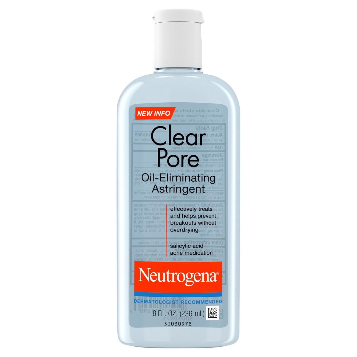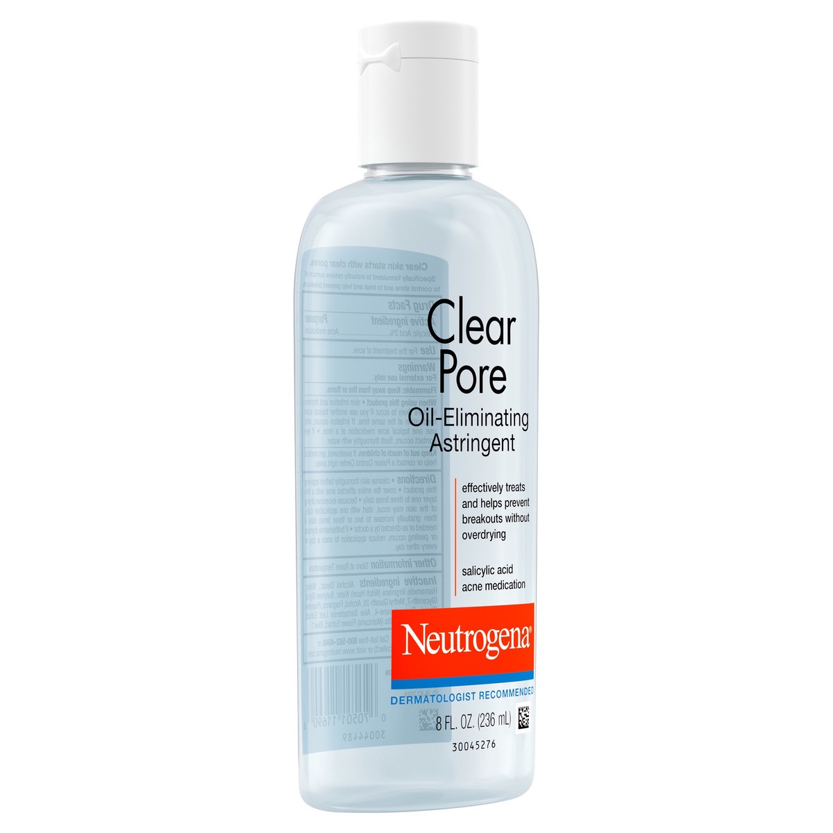 - One 8 fl. oz. bottle of Neutrogena Clear Pore Oil-Eliminating Facial Astringent Acne TonerFace Toner combines salicylic acid and witch hazel for effective cleansingTreat & prevent acne breakouts, blemishes, and blackheads without over-dryingSpecially formulated for acne-prone skin, toner instantly removes surface oil to control shineContains 2% salicylic acid acne treatment works to unclog poresA valuable addition to any regular acne skincare routine for maintaining healthy-looking skinApply after cleansing; start with one use per day, gradually increase as neededCan be used morning, afternoon, and night. Clear skin starts with clear pores