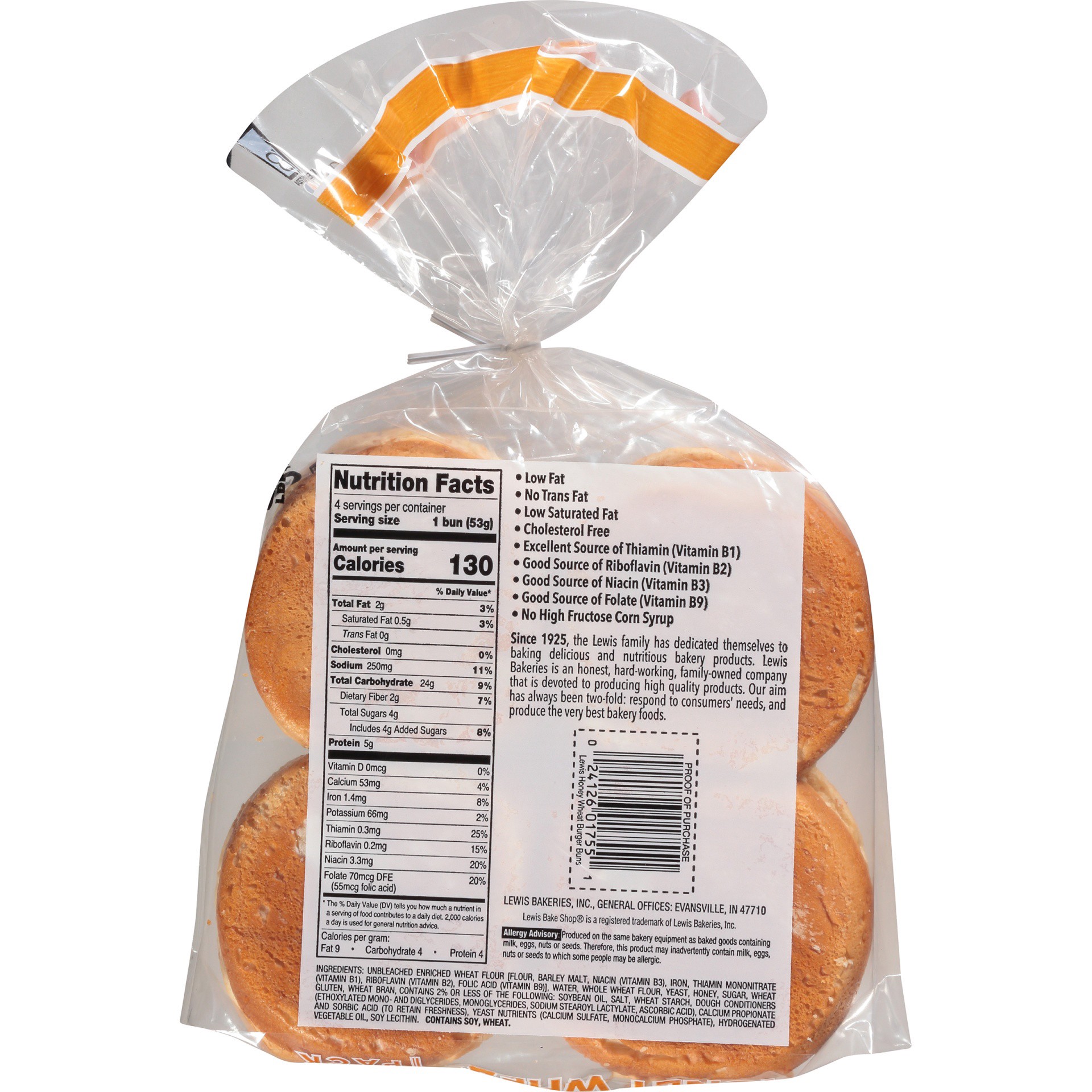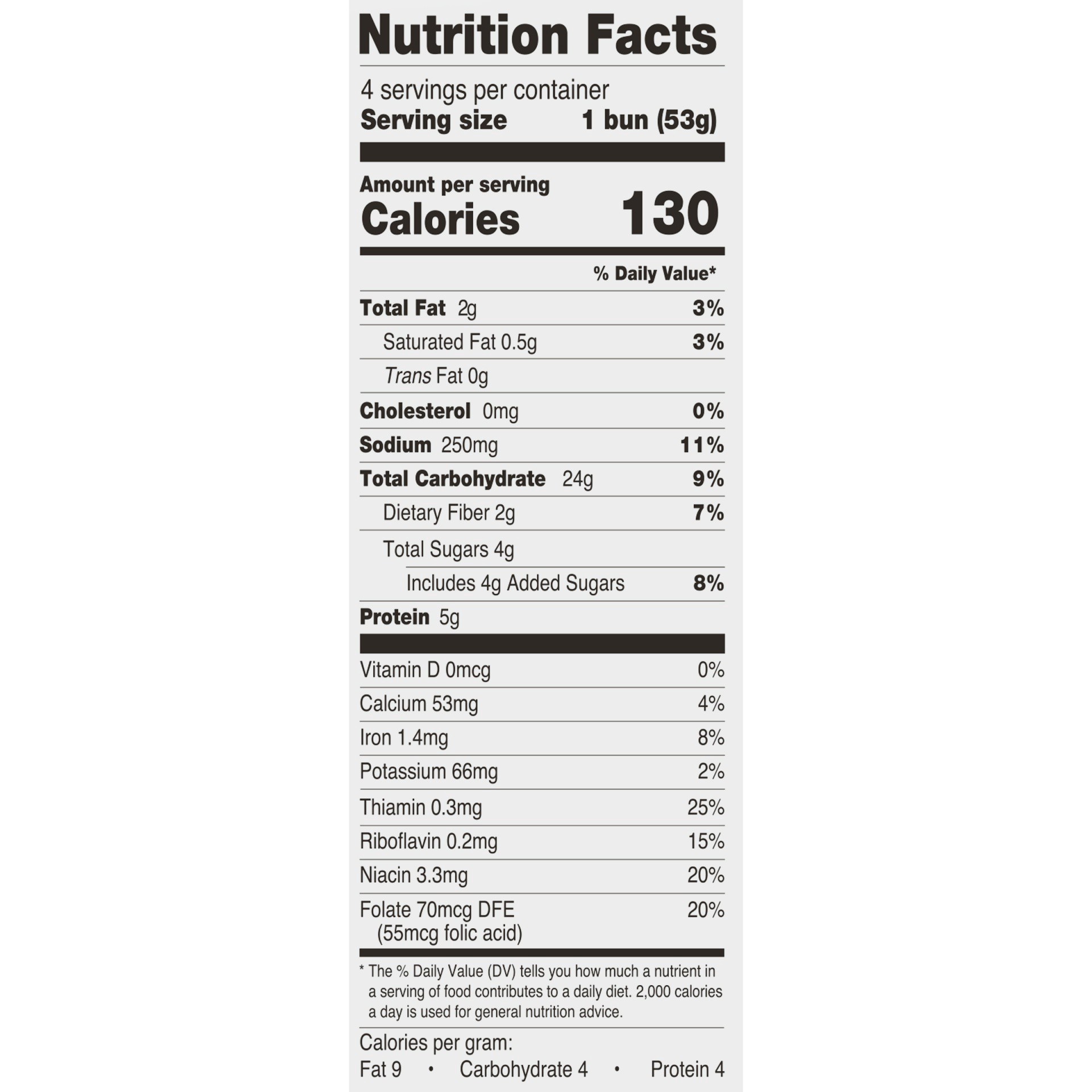 Family bakers since 1925. Per 1 Bun Serving: 140 calories; 0.5 g sat fat (3% DV); 210 mg sodium (9% DV); 3 g sugars. Low Fat. No Trans fat. Low Saturated Fat. Cholesterol Free. Excellent Source of Thi…