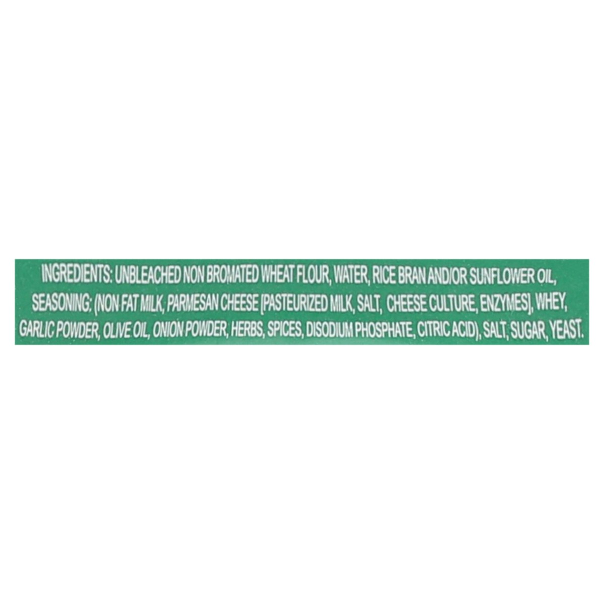 Unbleached Non Bromated Wheat Flour, Water, Rice Bran and/or Sunflower Oil, Seasoning: (Non Fat Milk, Parmesan Cheese [Pasteurized Milk, Salt, Cheese Culture, Enzymes], Whey, Garlic Powder, Olive Oil,…