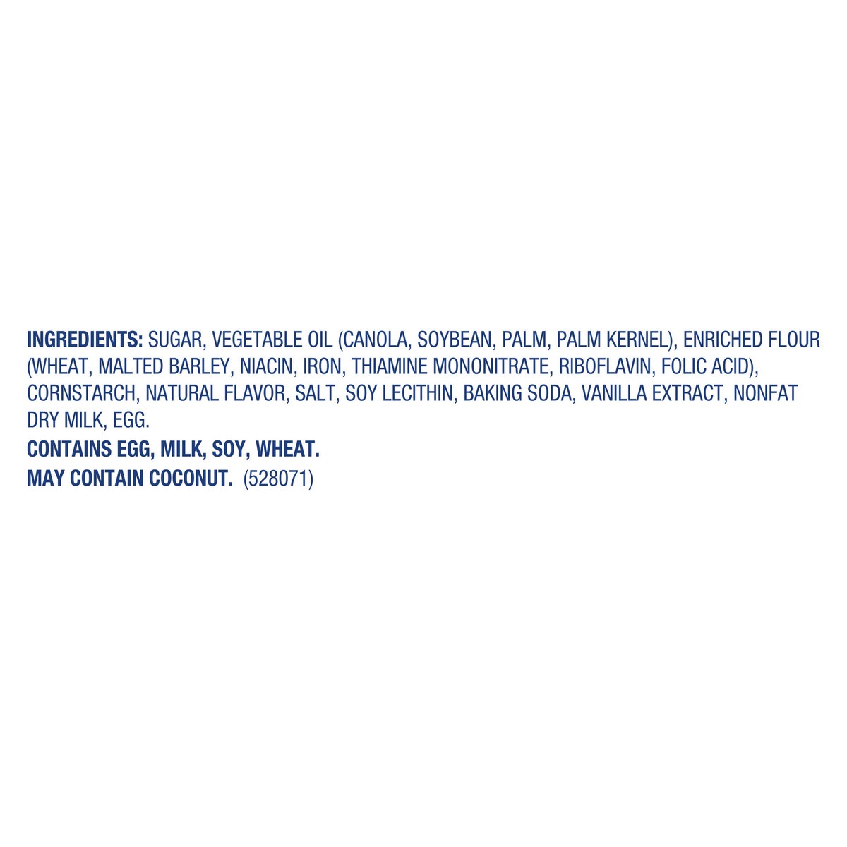 Sugar, Vegetable Oil (Canola, Soybean, Palm, Palm Kernel), Enriched Flour (Wheat, Malted Barley, Niacin, Iron, Thiamine Mononitrate, Riboflavin, Folic Acid), Cornstarch, Natural Flavor, Salt, Soy Leci…