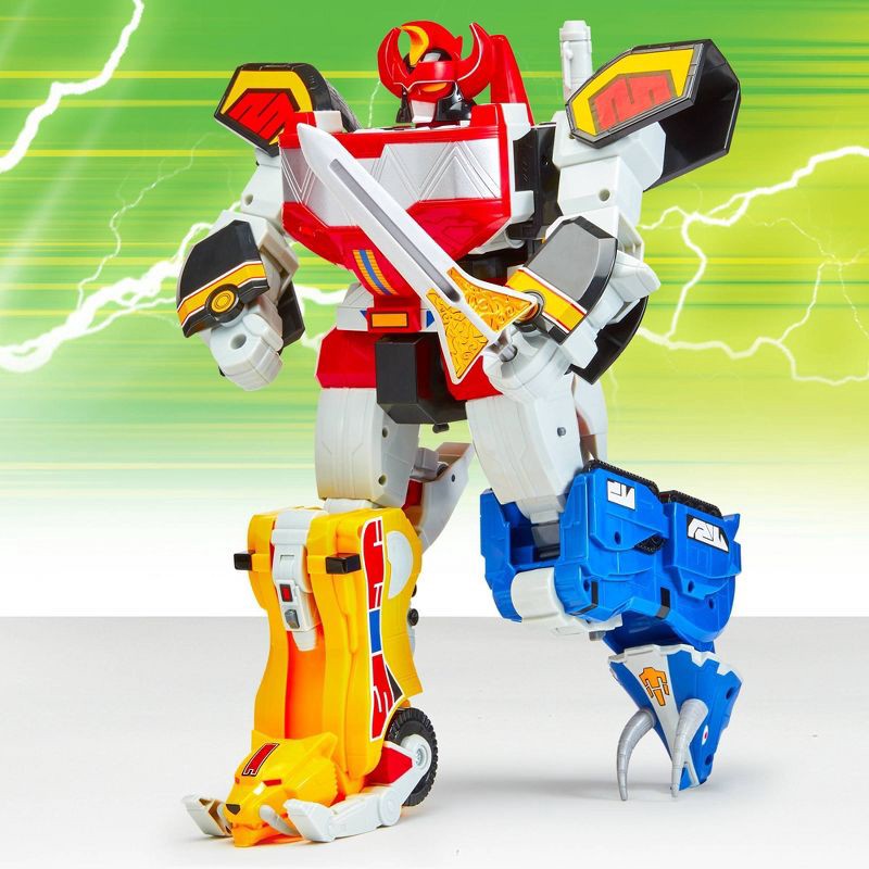- Combines with Tyrannosaurus, Mastodon, Pterodactyl, and Triceratops Dinozords to form the iconic Megazord (each sold separately)