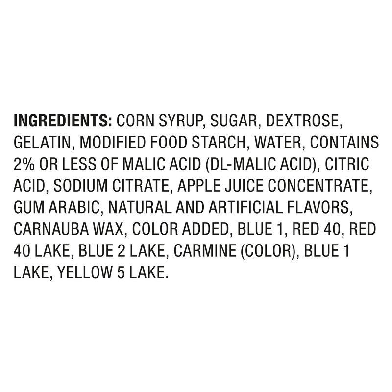 Corn Syrup, Sugar, Dextrose, Gelatin, Modified Food Starch, Water, Contains 2% or less of Malic Acid (Dl-Malic Acid), Citric Acid, Sodium Citrate, Apple Juice Concentrate, Gum Arabic, Natural and Arti…