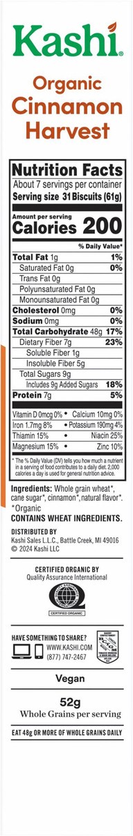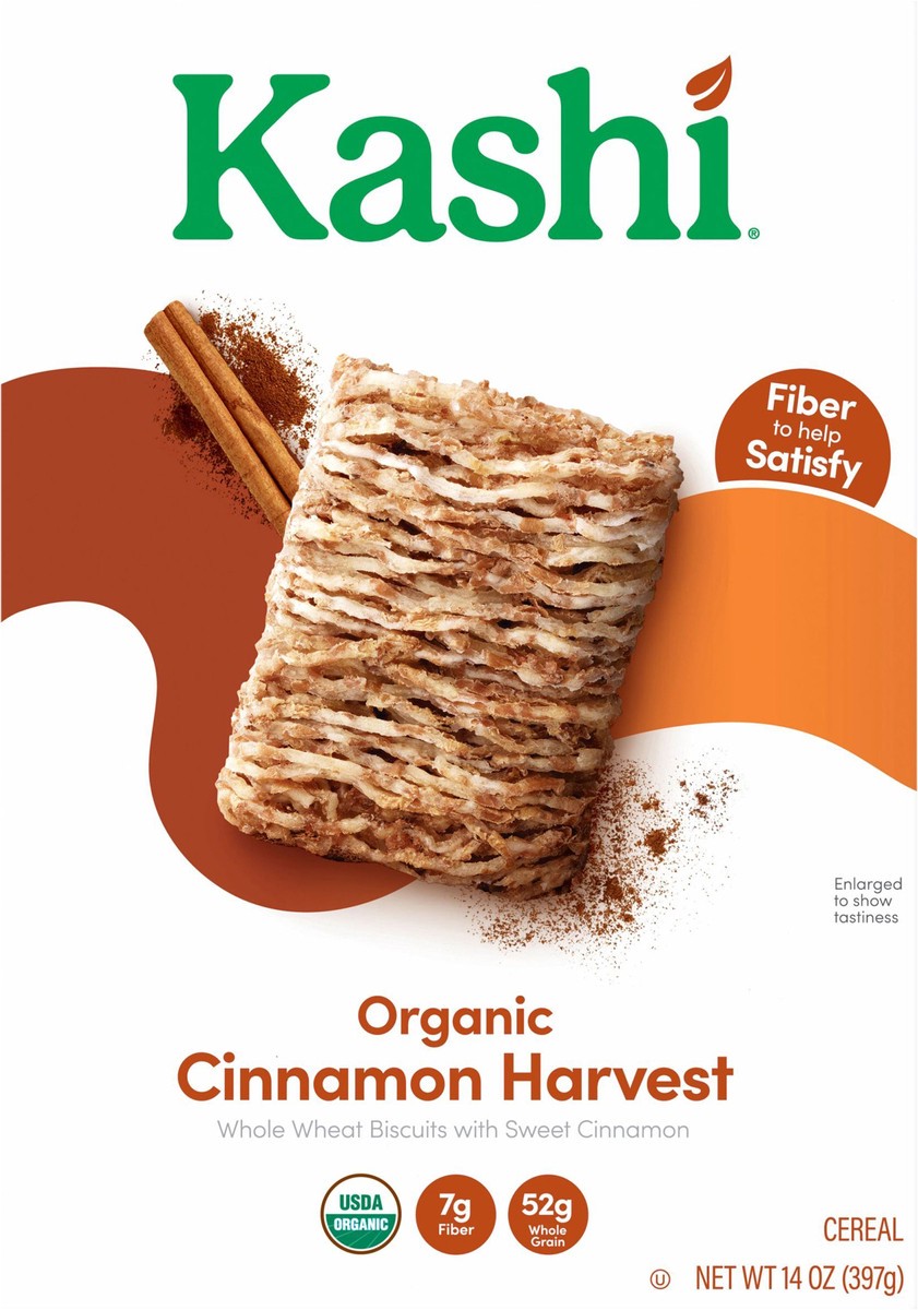Wake up and enjoy the tempting flavor of hearty whole grain biscuits topped with cinnamon in each bite of Kashi Cinnamon Harvest cereal. This 100% whole grain breakfast cereal contains 7g of protein a…