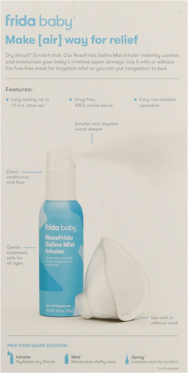 Dry throat? Scratch that. The NoseFrida Saline Mist Inhaler instantly and gently soothes and moisturizes your baby's irritated upper airways, and helps relieve symptoms like congestion and discomfort …