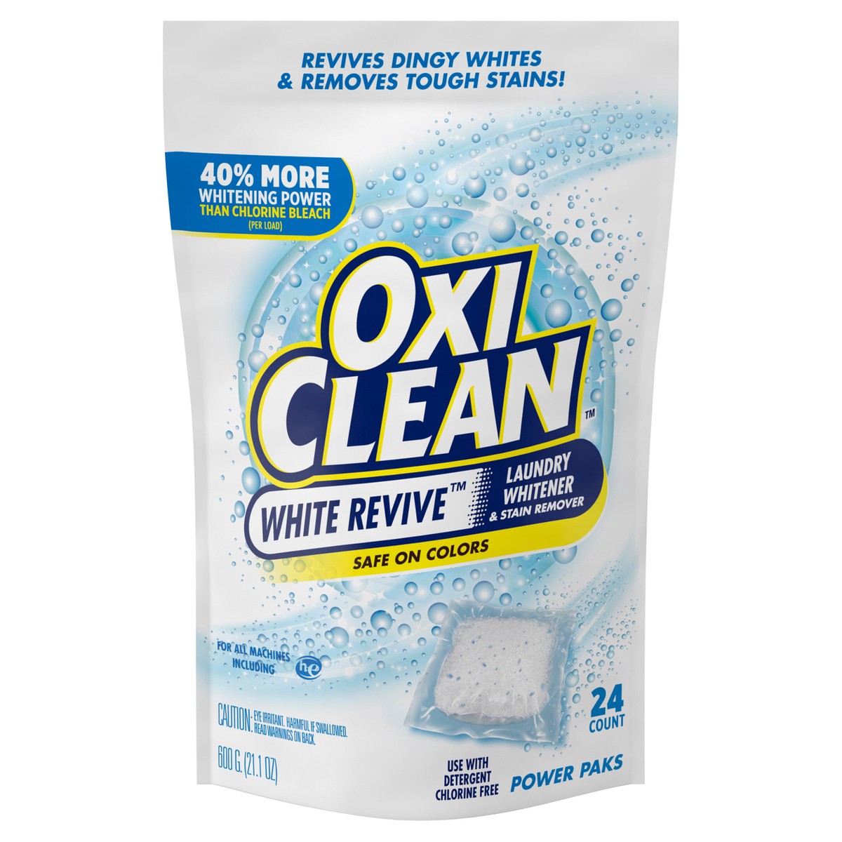 Revive dingy whites and remove tough stains with OxiClean White Revive Laundry Whitener and Stain Remover Power Paks. This laundry detergent booster whitens whites 40 percent better than chlorine blea…