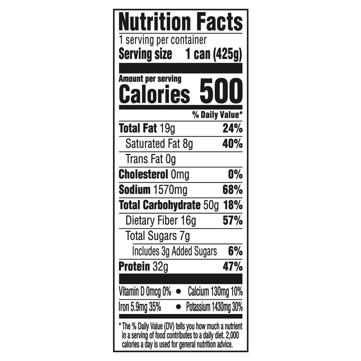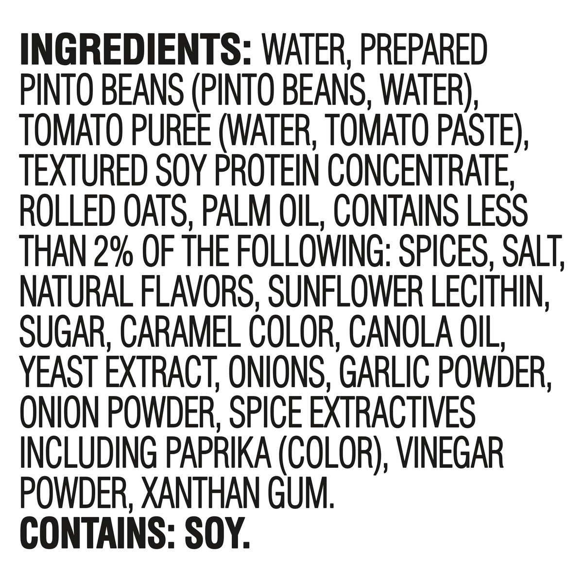 Water, Prepared Pinto Beans (Pinto Beans, Water), Tomato Puree (Water, Tomato Paste), Textured Soy Protein Concentrate, Rolled Oats, Palm Oil, Contains Less than 2% of the Following: Spices, Salt, Nat…