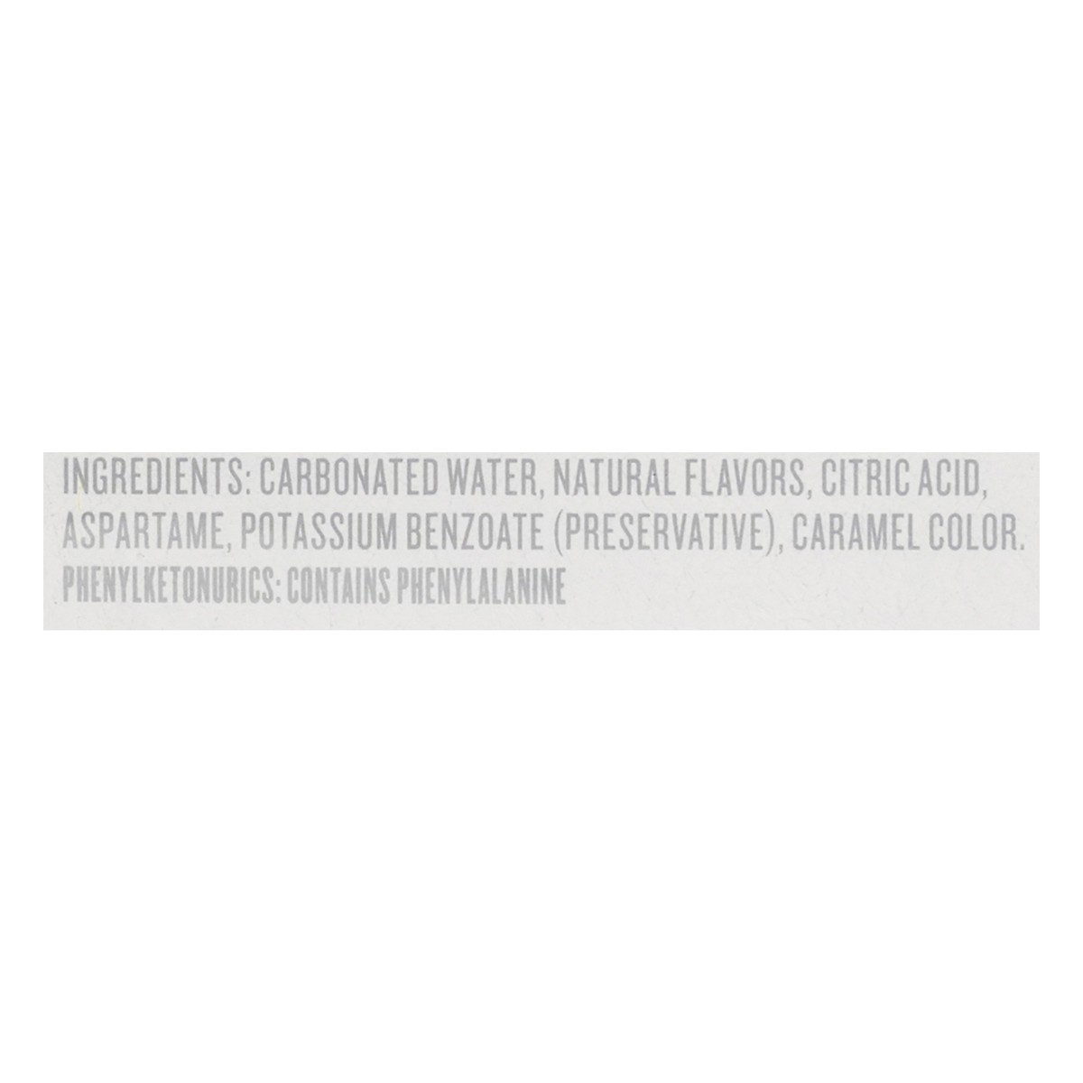 Carbonated Water, Natural Flavors, Citric Acid, Aspartame, Potassium Benzoate (Preservative), Caramel Color.