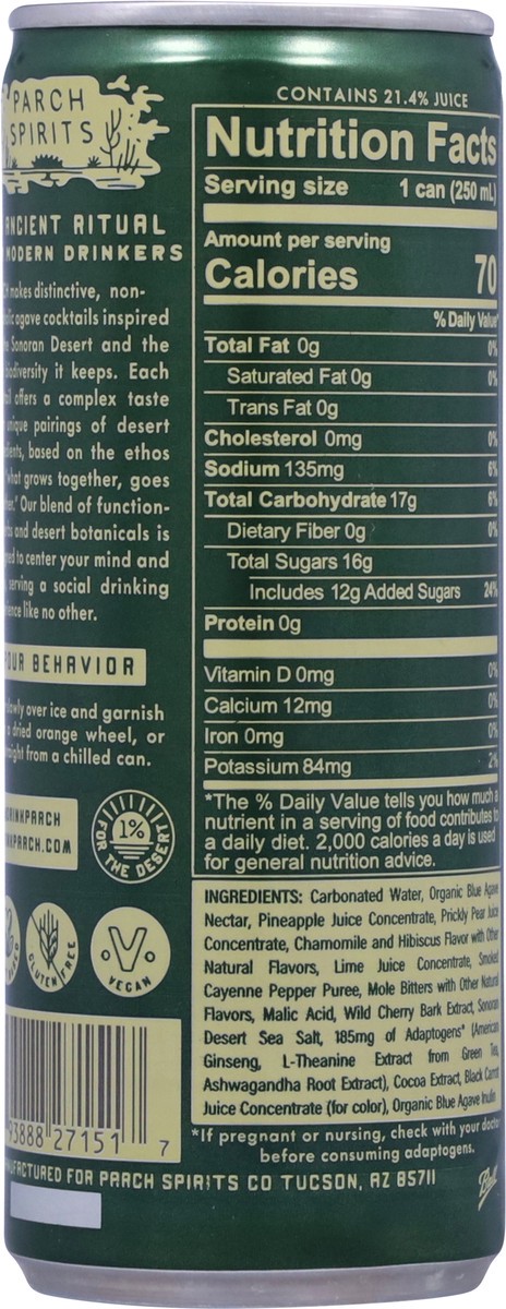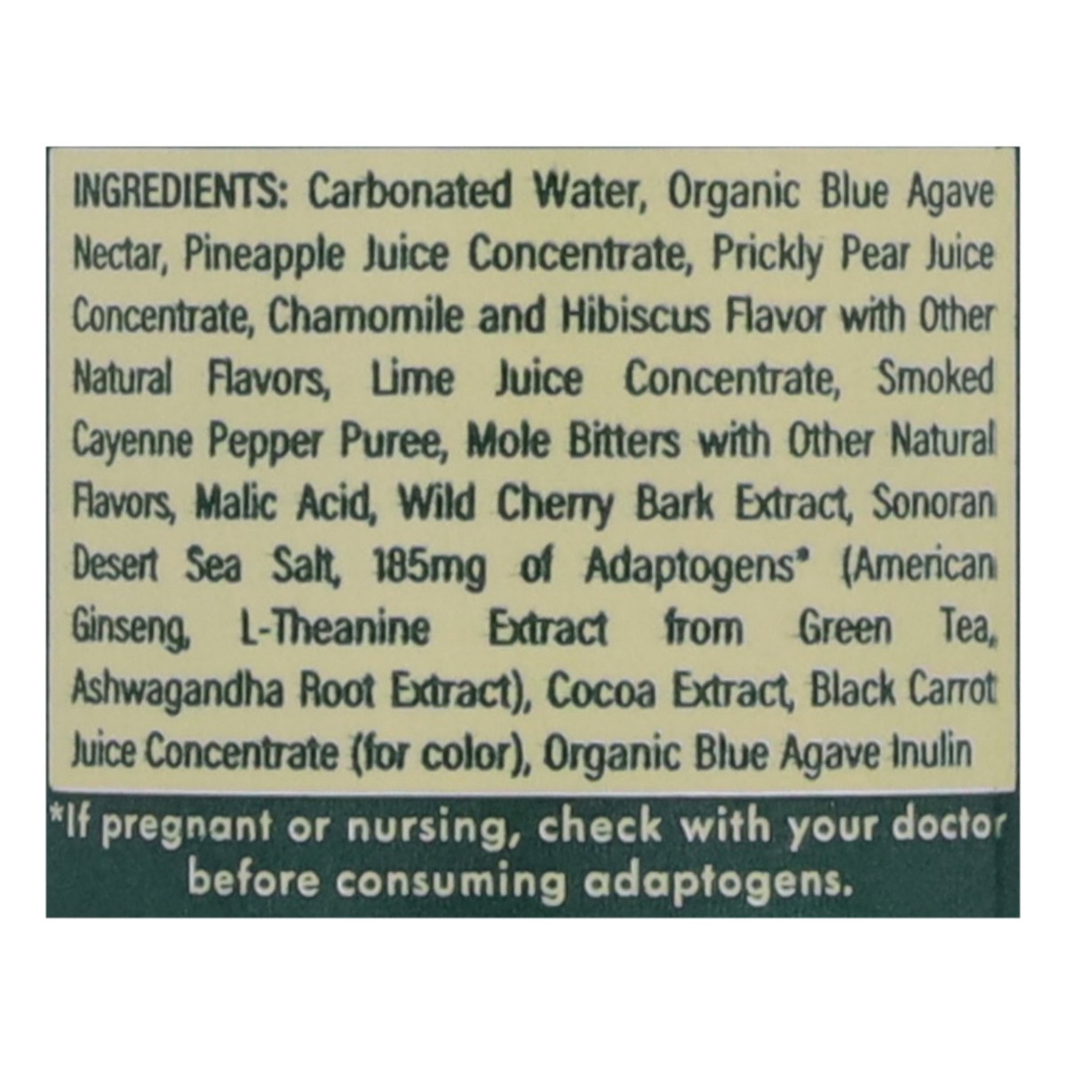 Carbonated Water, Organic Blue Agave Nectar, Pineapple Juice Concentrate, Prickly Pear Juice Concentrate, Chamomile and Hibiscus Flavor with Other Natural Flavors, Lime Juice Concentrate, Smoked Cayen…