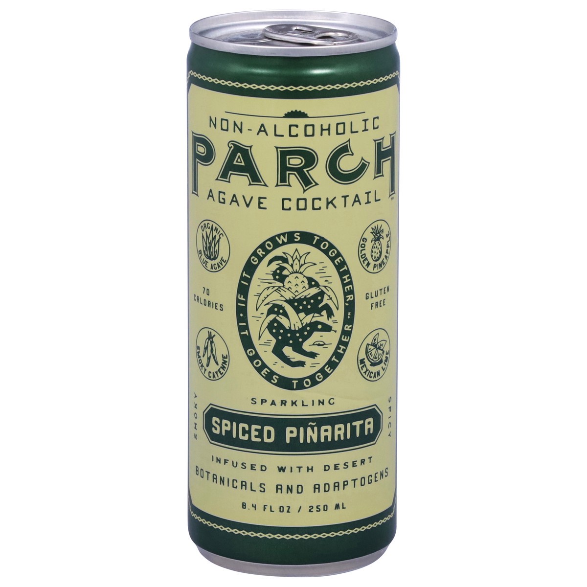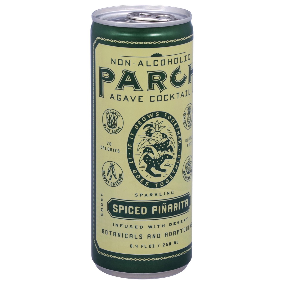 Spiced Piñarita: A Smoky and Spicy Mezcalita cocktail that combines pineapple juice, and smoked cayenne pepper with earthy Organic Blue Agave, Mole Bitters, Desert Botanicals and Active adaptogens.-L-…