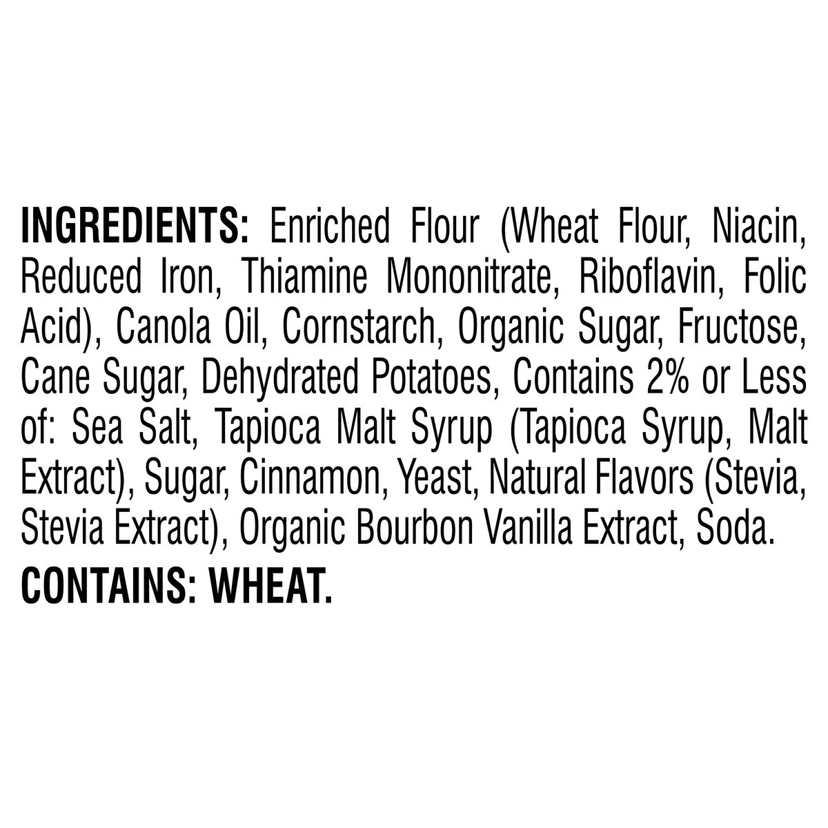 INGREDIENTS: ENRICHED FLOUR (WHEAT FLOUR, NIACIN, REDUCED IRON, THIAMINE MONONITRATE, RIBOFLAVIN, FOLIC ACID), CANOLA OIL, CORNSTARCH, ORGANIC SUGAR, FRUCTOSE, CANE SUGAR, DEHYDRATED POTATOES, CONTAIN…