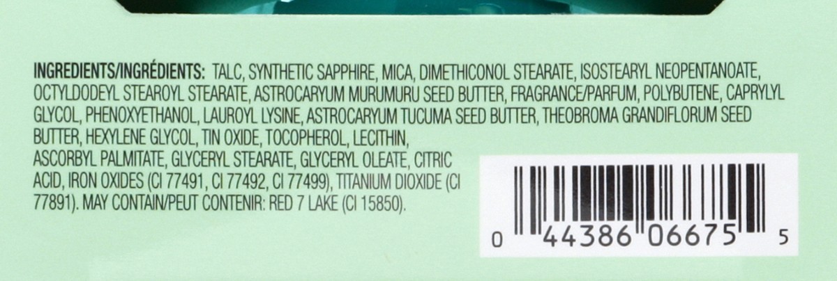 Talc, Synthetic Sapphire Mica, Dimethiconol Stearate, Isostearyl Neopentanoate, Octyldodeyl Stearoyl Stearate, Astrocaryum Murumuru Seed Butter, Fragrance/Parfum, Polybutene, Caprylyl Glycol, Phenoxye…