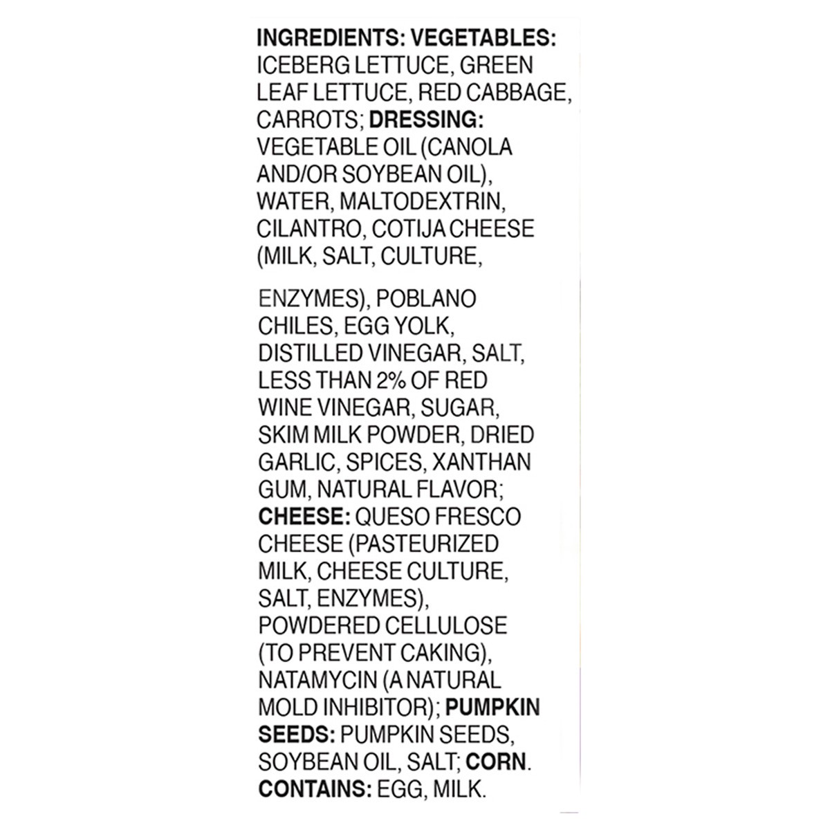 Vegetables: Iceberg Lettuce, Green Leaf Lettuce, Red Cabbage, Carrots; Dressing: Vegetable Oil (Canola and/or Soybean Oil), Water, Maltodextrin, Cilantro, Cotija Cheese (Milk, Salt, Culture, Enzymes),…