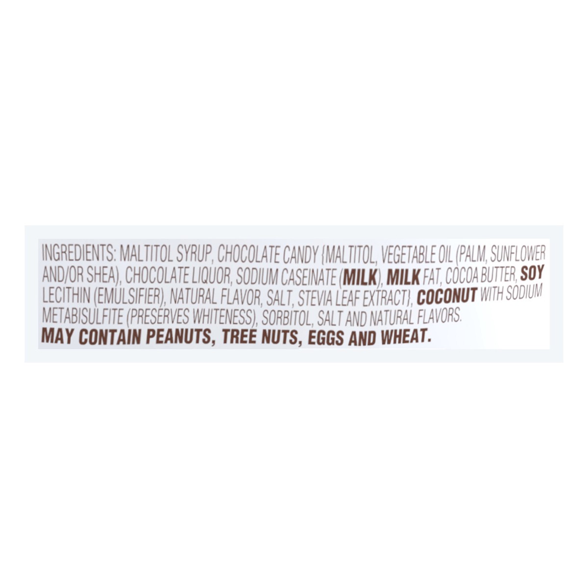 Malitol syrup, chocolate candy, chocolate liquor, sodium caseinate, milk fat, cocoa butter, soy lecithin, natural flavor, salt, stevia leaf extract, coconut, sorbitol, natural flavors