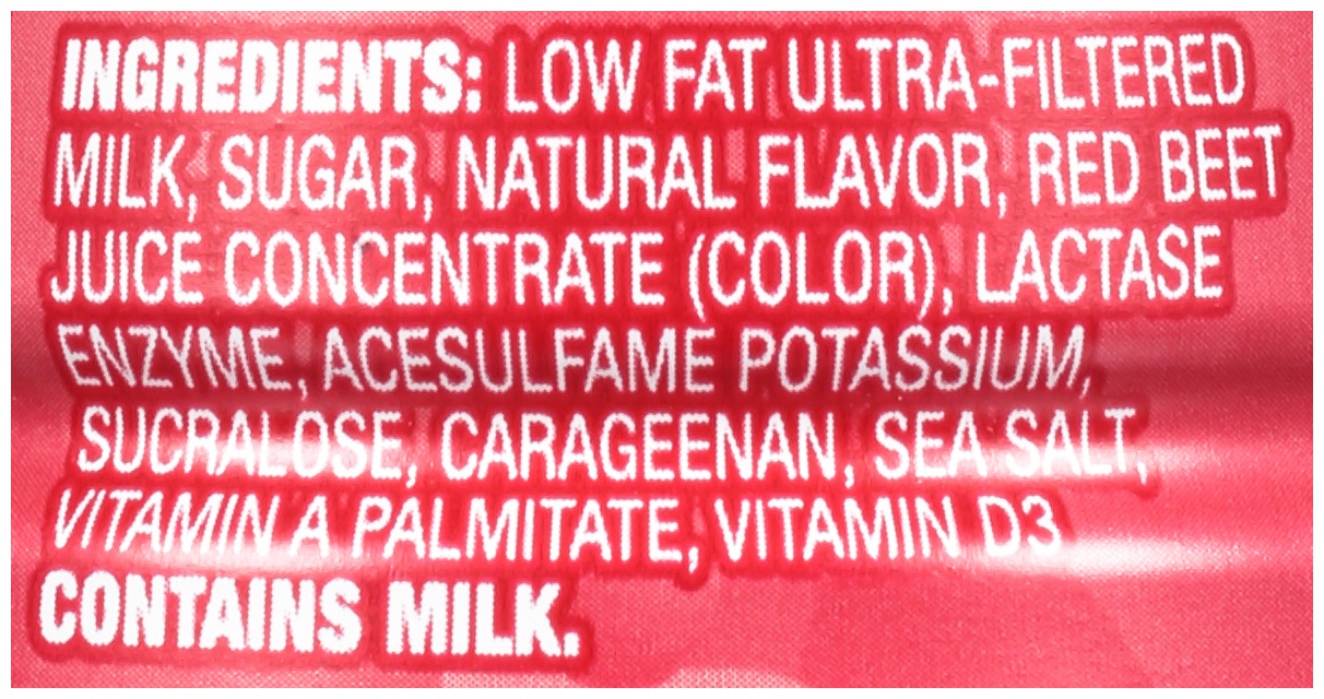 Filtered Reduced Fat Grade A Milk, Sugar, Contains Less than 1% of Natural Flavors, Modified Starch, Cellulose Gel, Cellulose Gum, Lactase Enzyme, Acesulfame Potassium, Carrageenan, Sea Salt, Red Toma…