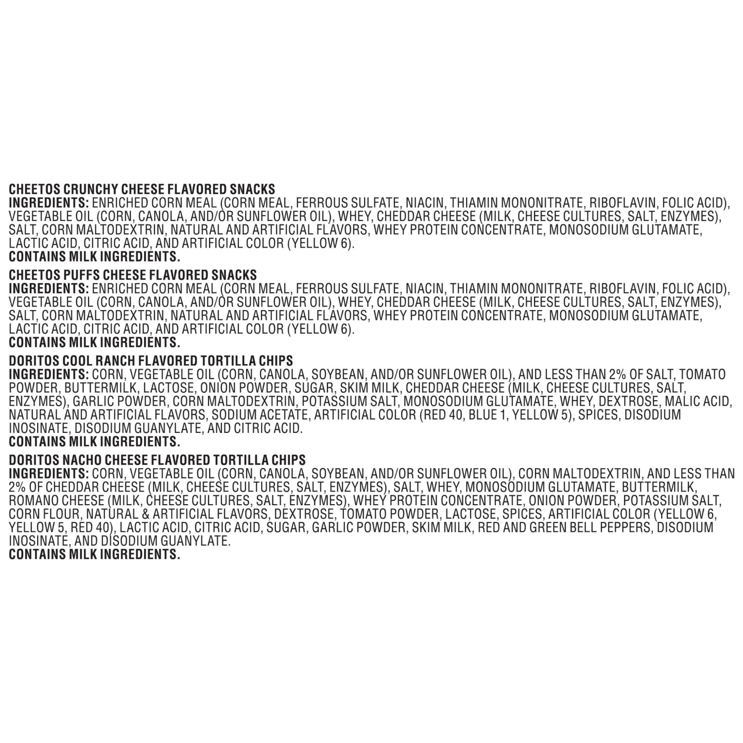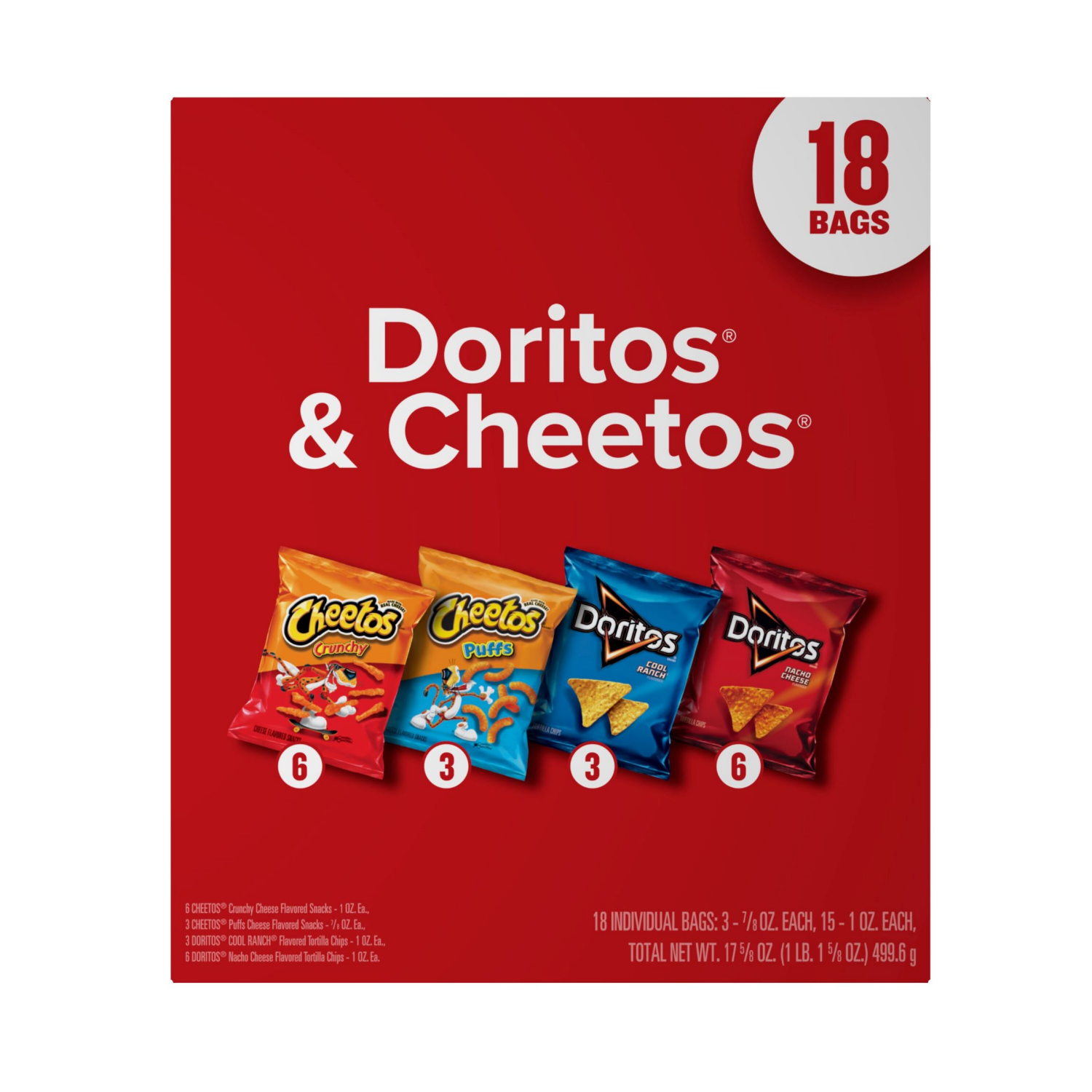 Frito Lay Doritos Cheetos Variety Pack contains the following bags: 6 Doritos, 3 Dorito Ranch, 3 Cheetos Puffs, 6 Cheetos Crunchy. Perfect for a snack or lunch.
