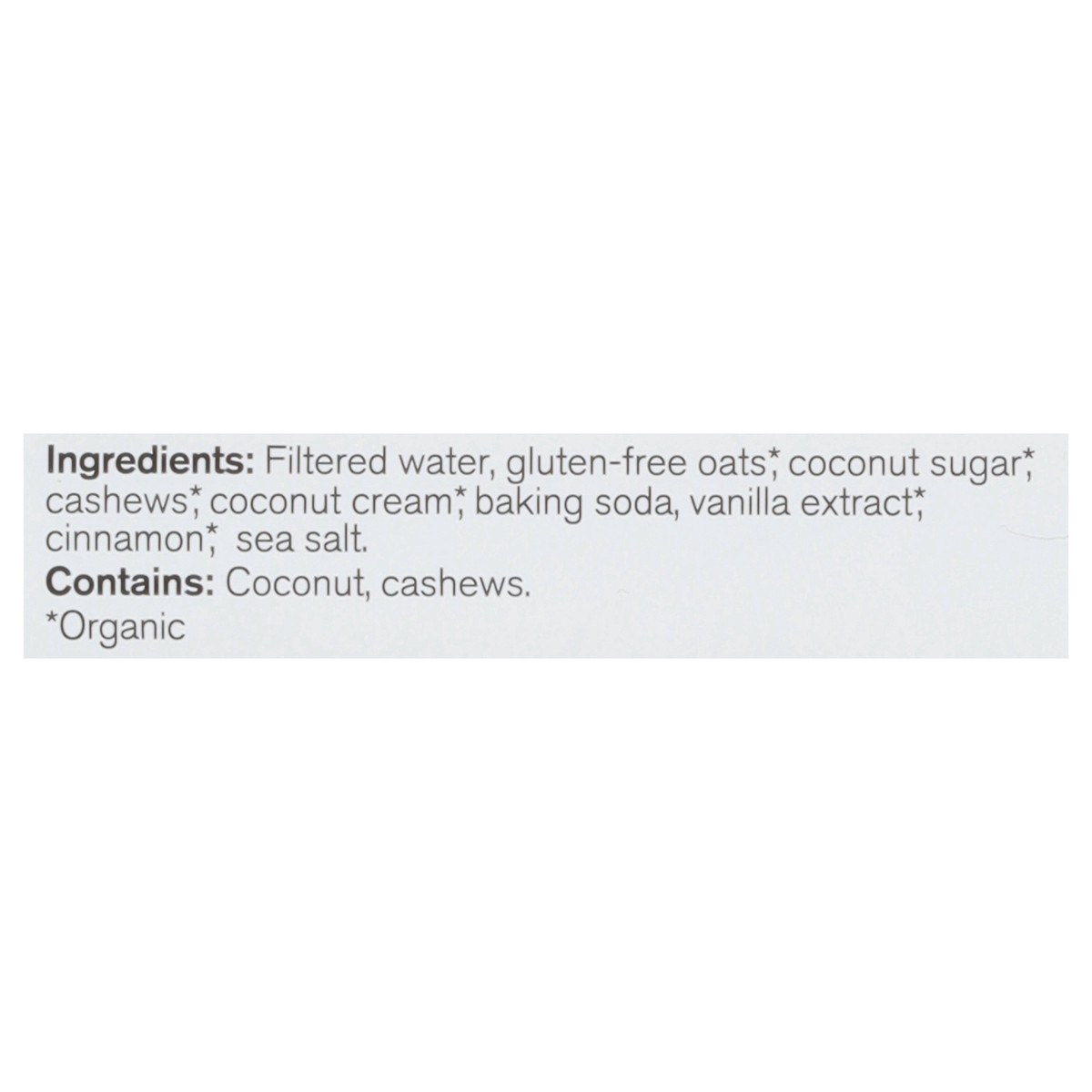 Filtered Water, Gluten-Free Oats*, Coconut Sugar*, Cashews*, Coconut Cream*, Cinnamon*, Baking Soda, Vanilla Extract*, Cinnamon*, Sea Salt. * Organic.